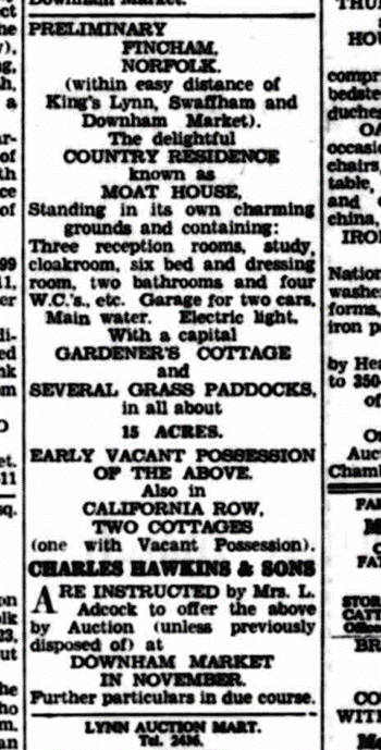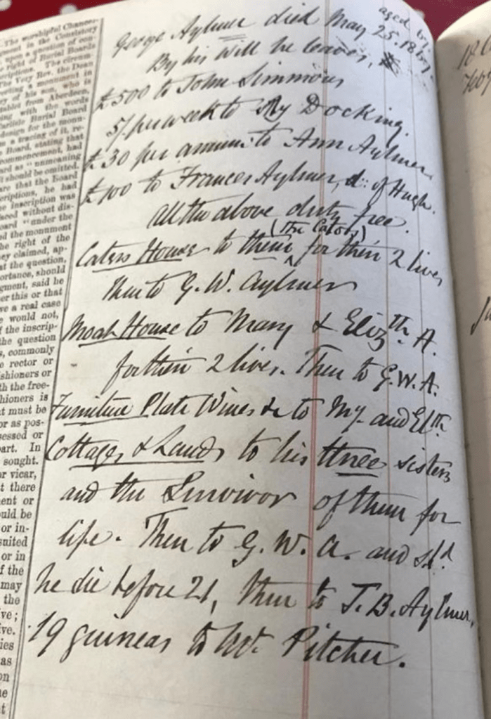 William Blyth gave a precis of George Aylmer’s will in the Land Tax book. Later entries refer to both Moat House and California Cottages being owned by the Aylmer sisters.