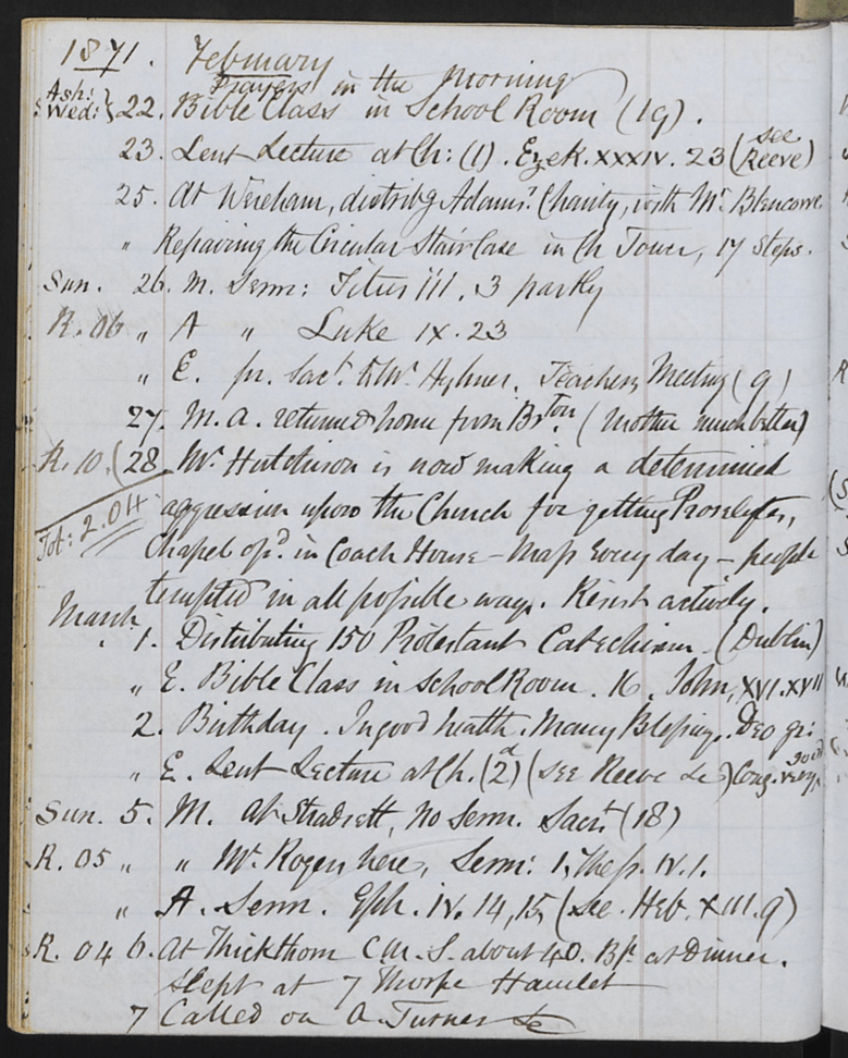 1871 Feb 28th Mr Hutchison is now making a determined aggression upon the church for getting proselytes. Chapel opened in coach house mass every day. people tempted in all possible ways. (see Blyth diary entry above)