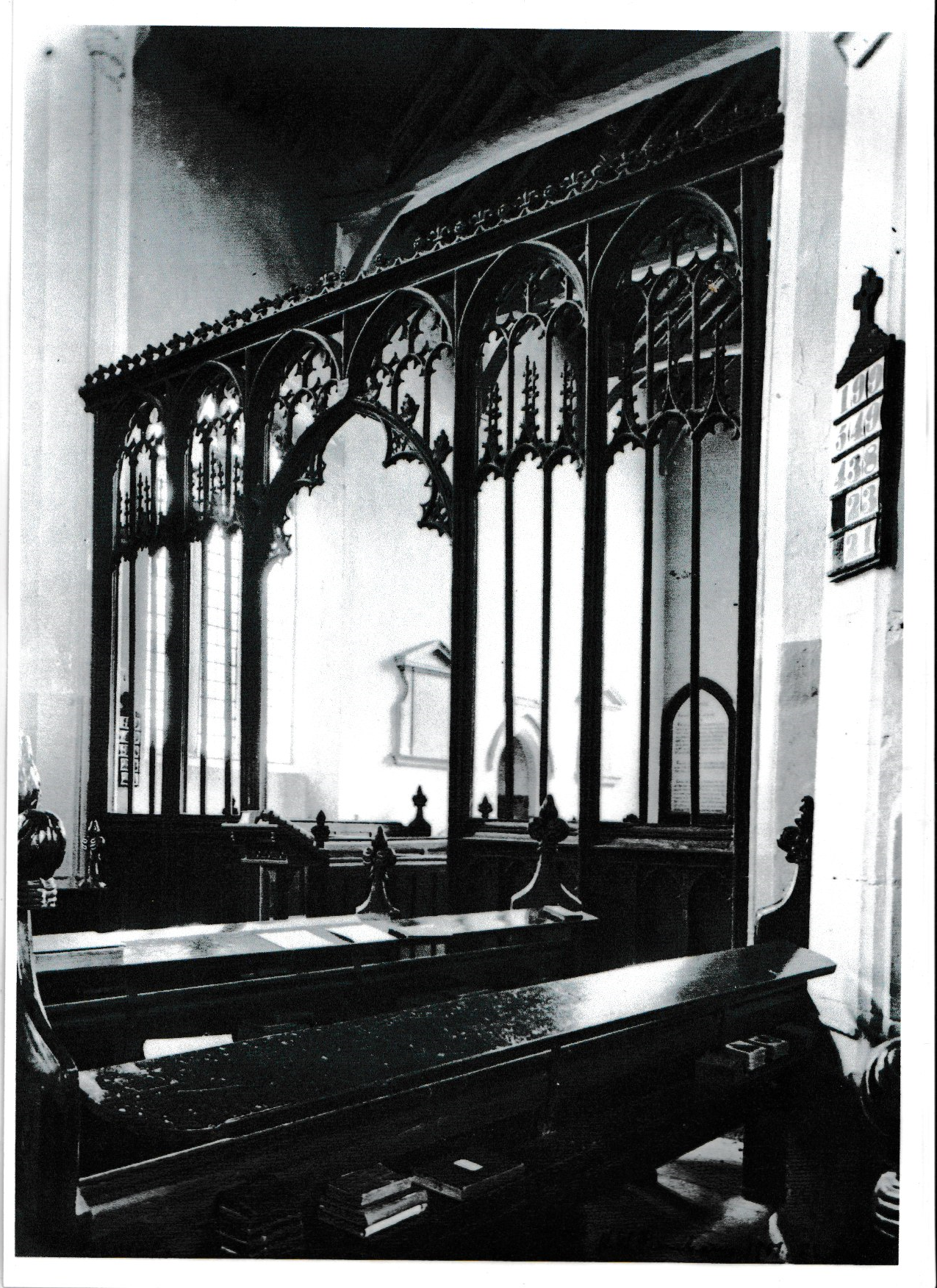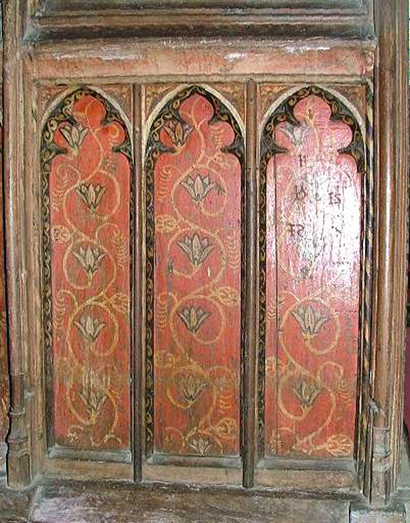 Our research on the rood screen – undertaken by one of our number – suggests that much of it is original and probably dates from the same period (1430s) or perhaps just a little later, perhaps 1440s/1450s. It is very fine and there appears to be only a small amount of repair or additional woodwork of a later date. The painting is likely to be original, but without doing a scrape and full analysis it is not possible to be certain about this.