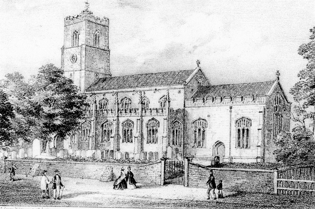 The lithograph from Blyth’s book of 1863 – which is supposed to have been done c. 1840. It shows the clock which was installed in 1844 so it is post that date. The roadside wall is the same as it is now. The buttresses have certainly been effective. The people seem rather small!