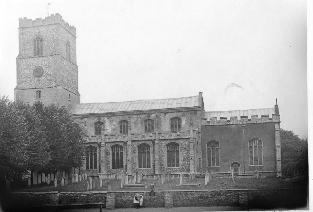 There is a description of St. Michael’s in Blomefield’s History, published about 1760. It was ‘built of flint and boulder and consists only of a nave, or body, with a chancel covered in lead. At the west end of the nave stands a large square tower embattelled with quoins and copings of free-stone, and a pinnacle at each corner; and herein hangs three bells. The length of the nave is about 60 feet and in breadth about 27feet The chancel is in length about 33 feet and in breadth about 18 feet also a little freestone porch or passage into the chancel; in the centre of the arch there seems to be cinquefoils cut, the arms of the Lords Bardolfs.’