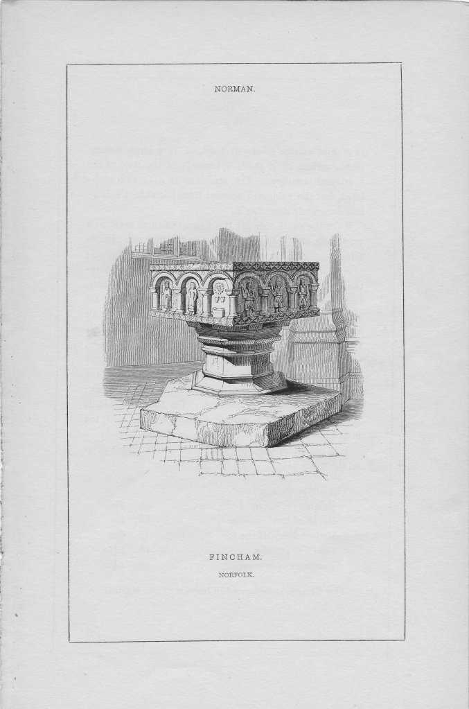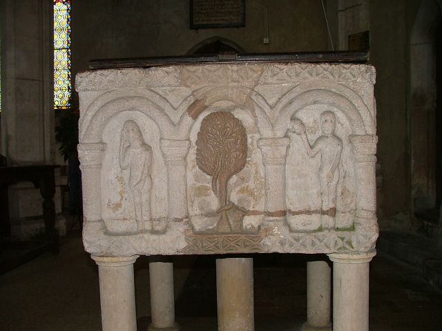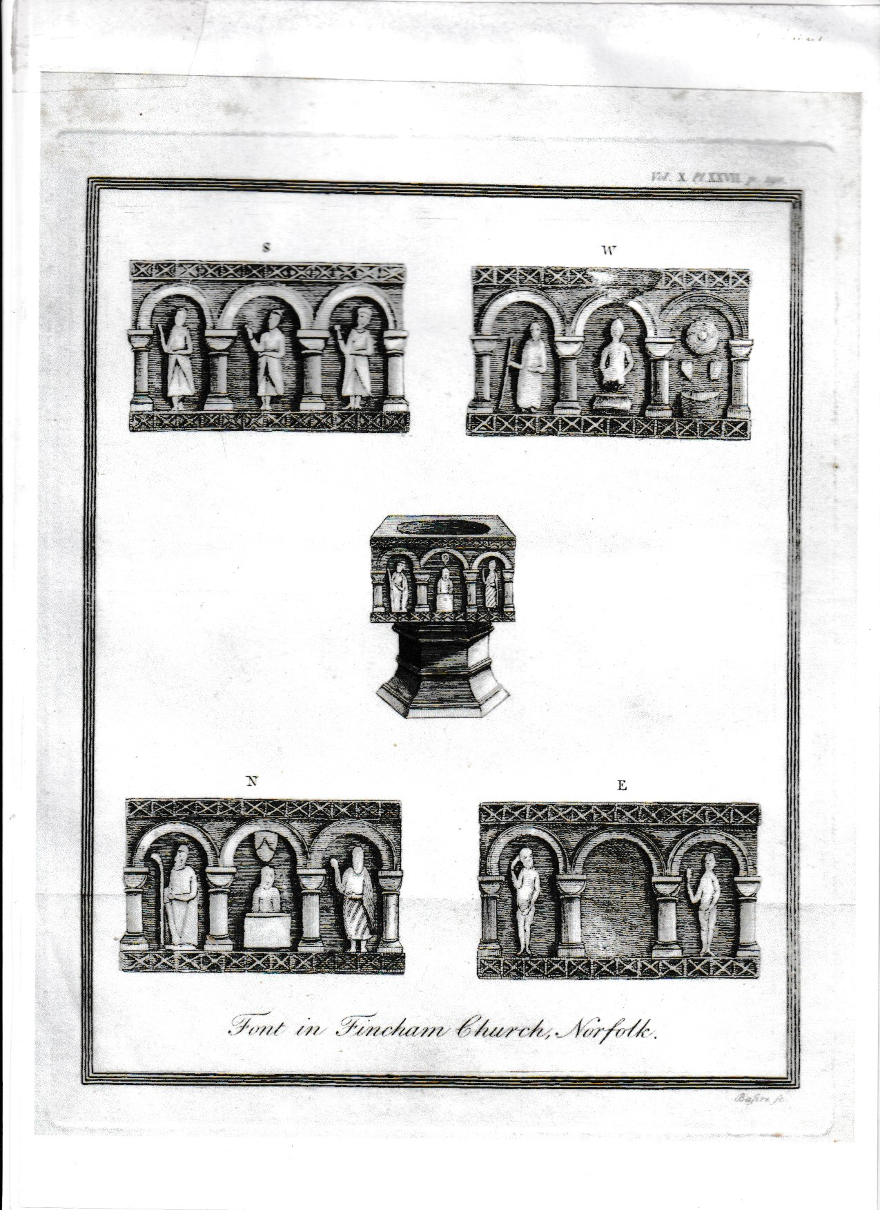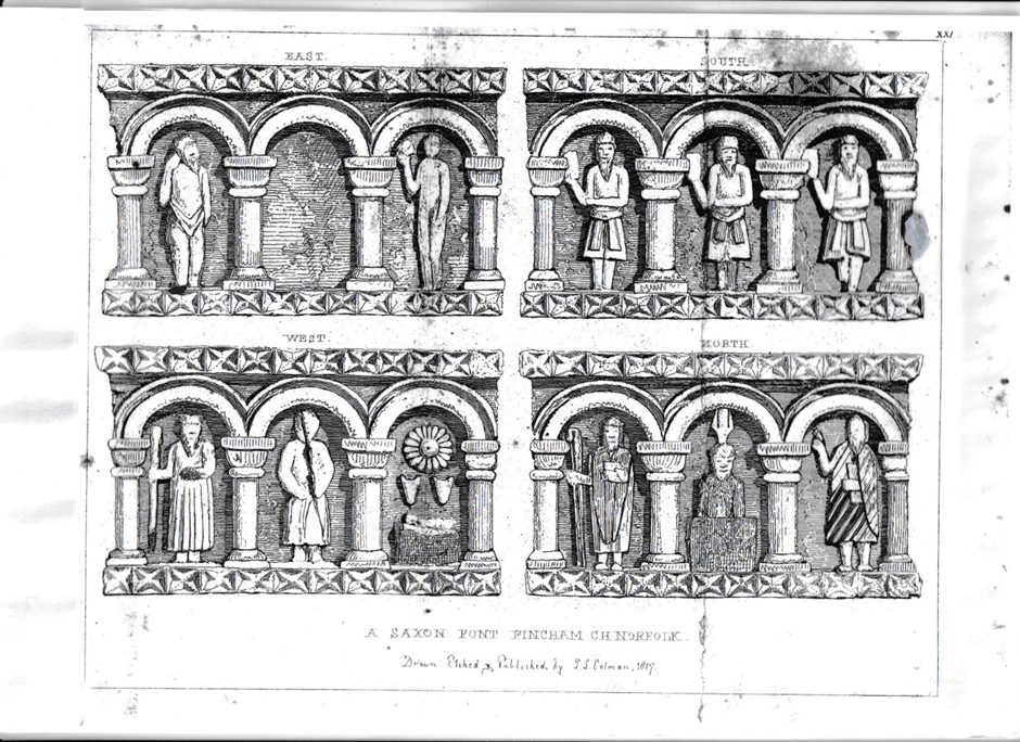 Here is an engraving of the font from 1817 done by John Sell Cotman, the famous artist of the Norwich School. The tree of knowledge is missing on this engraving. At some time since a tree of knowledge has been added but whether by someone who had an image of the original one or not is unknown.