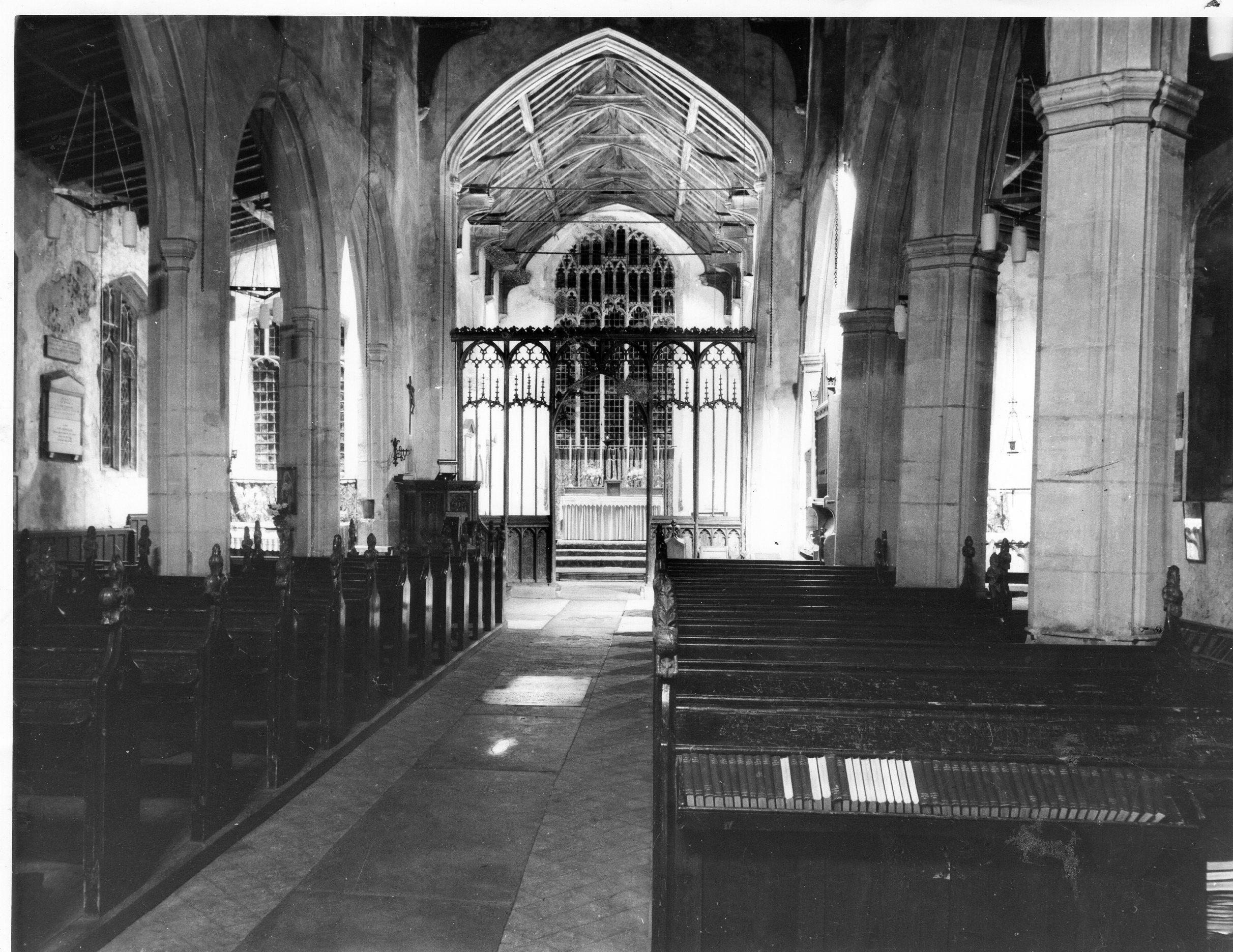 A 1950’s view looking towards the altar with its central aisle of massive slabs and old bricks. The complex pattern of the roof timbers is shown.