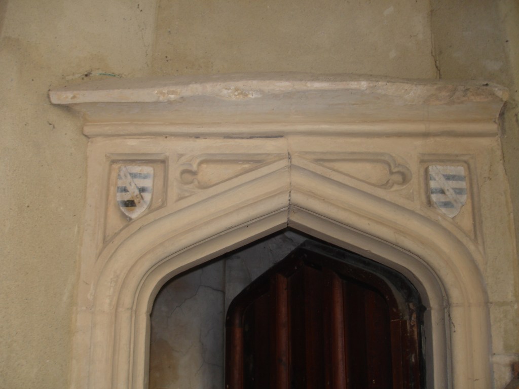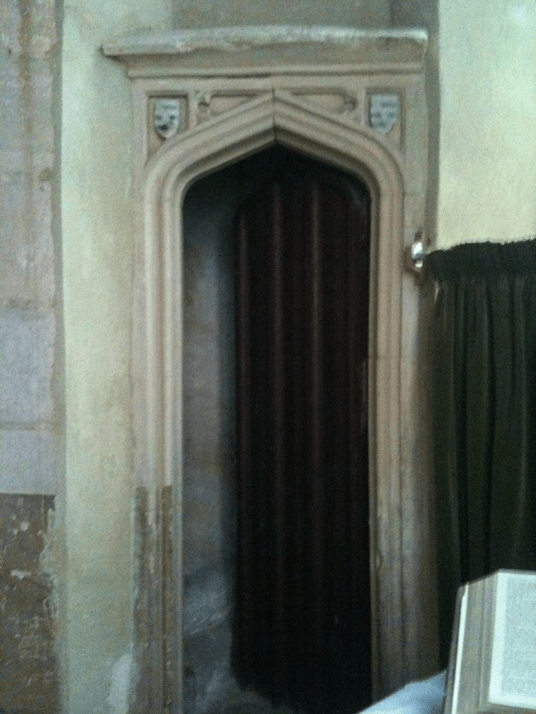 The door leading to the stairs to the top of the screen. It may have been used for lighting candles on the screen or less likely to a rood loft. Note the Fincham coat of arms.