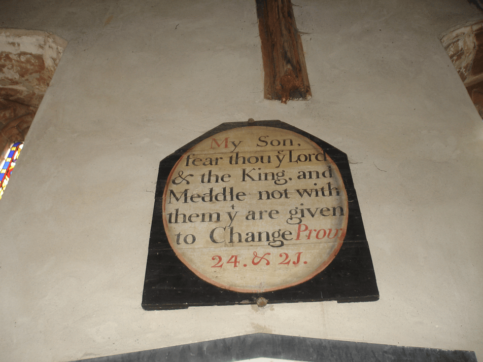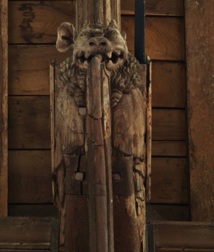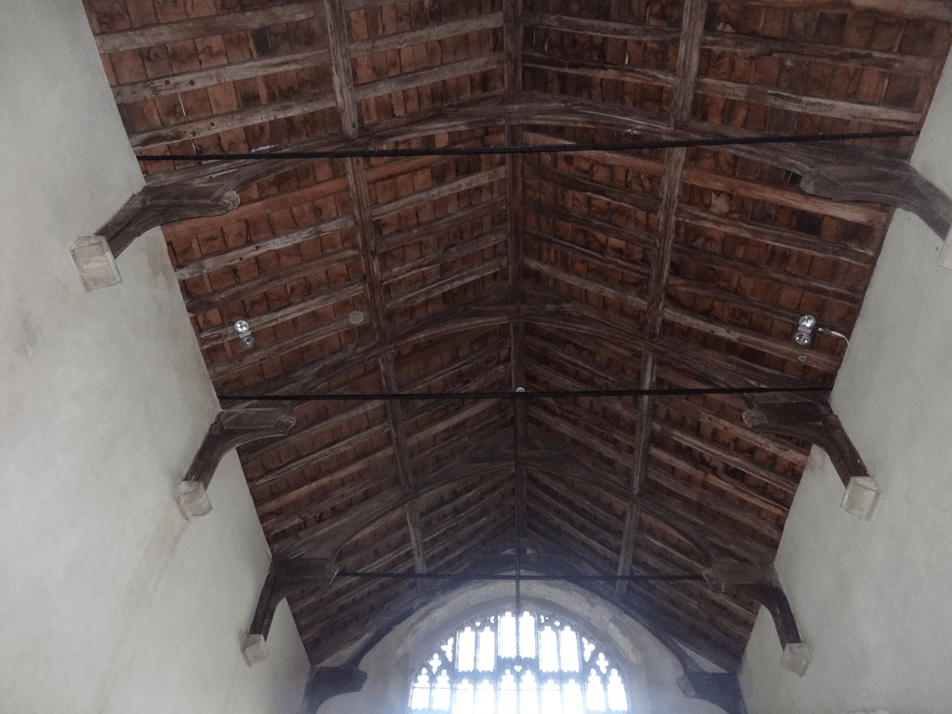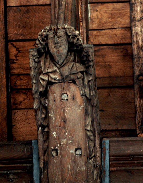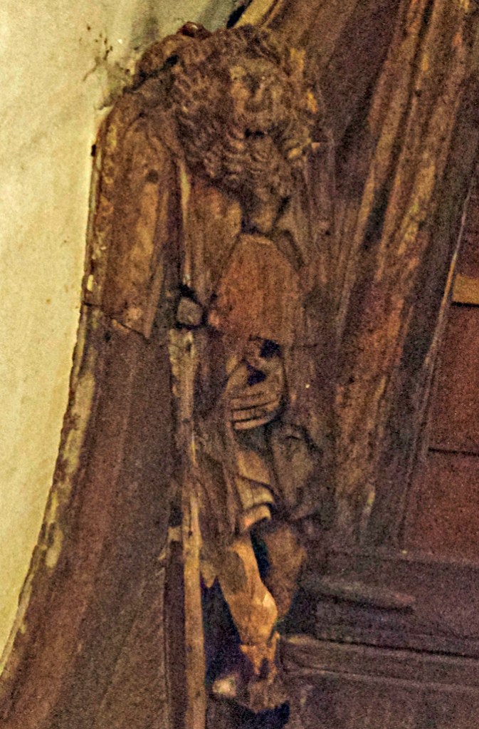These carvings on the roof posts are special to this area and are compared to those in Mildenhall and Outwell .The battle between good and evil is shown in the alternative figures of demons, some with tongues hanging out, and angels. According to the 2012 survey they appear to be carved by the same hand as those in the other two places mentioned.