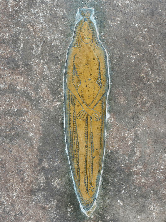 This one is described as ‘Lady in shroud’ and dates from c.1520. Its inscription is lost, It was recorded by Blomefield in 1775 as having no inscription. It is in the main aisle.