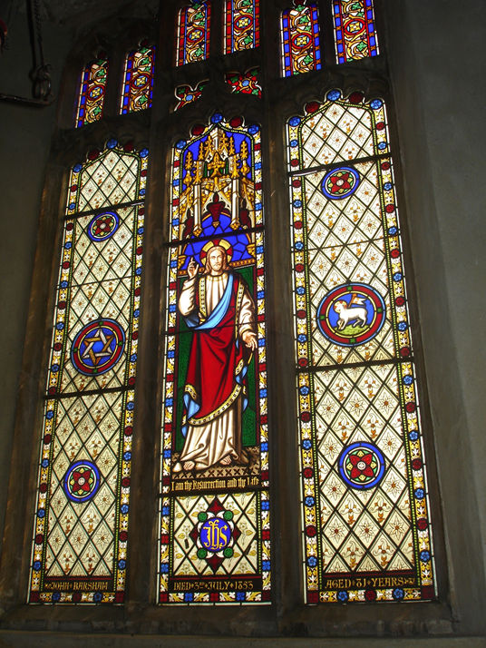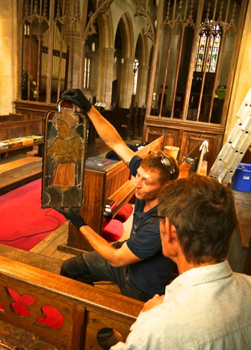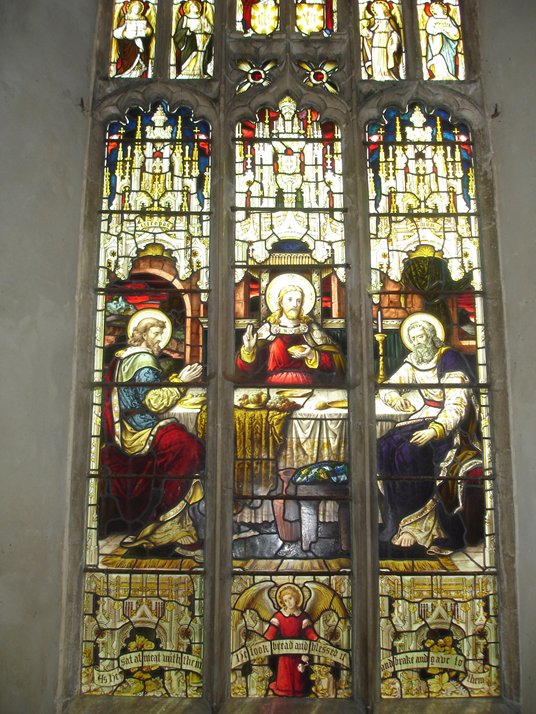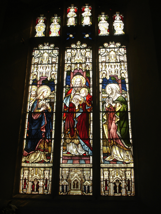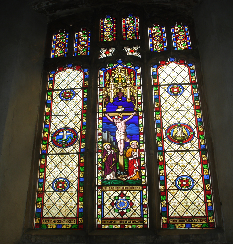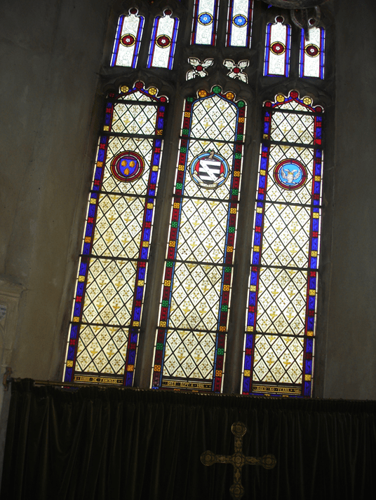 This chancel window is rather special. It has a good deal of original mid-15th century glass in it and original leadwork containing the glass. The whole window was taken to the Barley Studios near York in 2014 for restoration. Several pieces of old coloured glass had been replaced over the years by plain glass. It was decided to put new glass in and paint them the appropriate colour. Each new piece was signed and dated so future historians will know which is original 15th century glass. The window now has a special protective sheet of glass on the outside, cleverly distorted so there are no mirror like reflections, keeping the whole weatherproof.