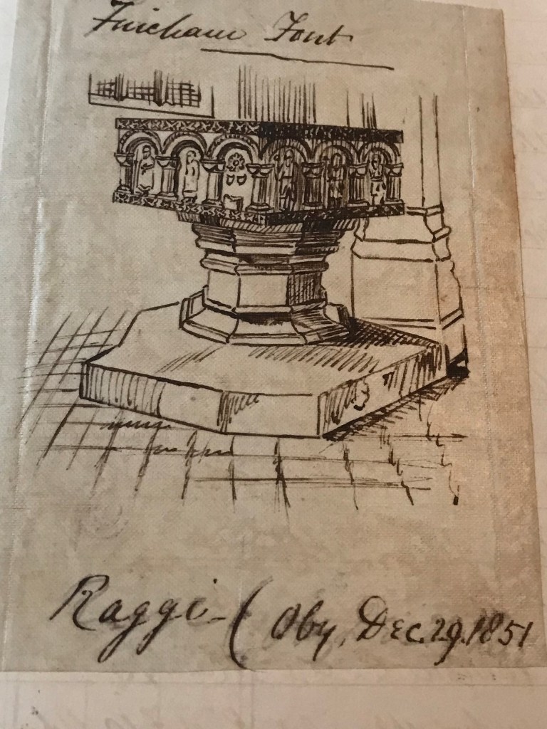 An engraving of the font found c.2010 in the vestry. It is by James Basire (1730-1802) who was an engraver to the Royal Society and to the Society of Antiquaries, specialising in architectural engravings. This print may be from ‘Vetusta monumenta’ produced by the Society of Antiquaries. It must be post-1744 when the font was moved to St. Martin’s but it has a different base to the present one. This is the base that probably the present pulpit is on.