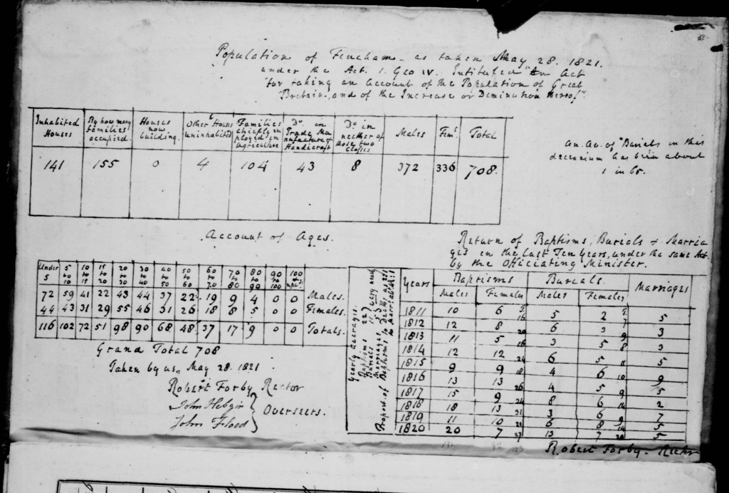 It’s 1821 and Fincham is required by an Act of Parliament to record its population. Rev Robert Forby is the rector and John Hebgin and John Flood the Overseers.