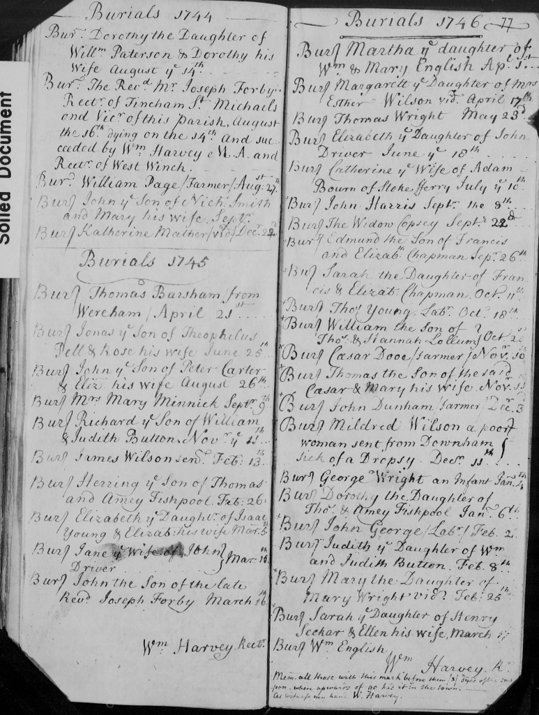 This entry begins with burials in 1744 which includes that of Rev Joseph Forby and the announcement that his successor is Rev. William Harvey M.A. Rector of West Winch. In 1745 there is the burial of Rev Joseph Forby’s son John who died aged 9. In 1746 Rev. Harvey has added a note at the bottom of the page. It says ‘Mem: all those with this mark (x) dyed of smallpox when upwards of 90 had it in this town.’ Some of the smallpox victims are children. Francis and Elizabeth Chapman lost a son and a daughter within a month. Mildred Wilson is ‘a poor woman sent from Downham’ who ‘died of the dropsy.’