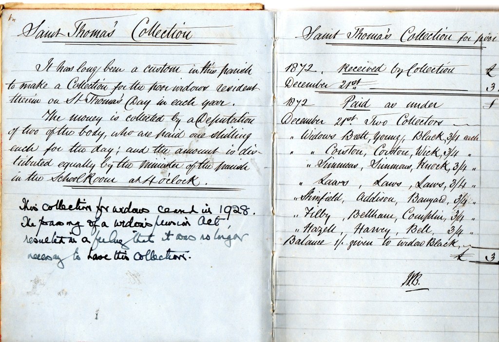 This is a note about the custom in the parish to make a collection on St. Thomas’ Day for the poor widows resident therein. There is a note written in the twentieth century to say that this collection ceased in 1928. It says ‘The passing of a widows pension Act resulted in a feeling that it was no longer necessary to have a collection.’