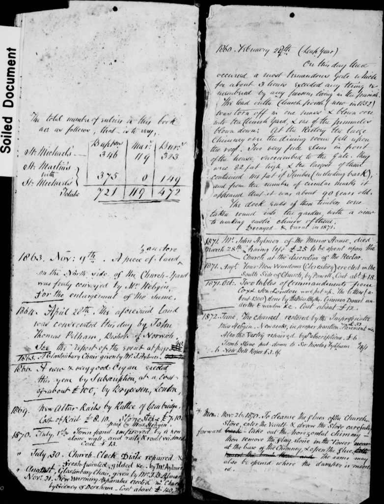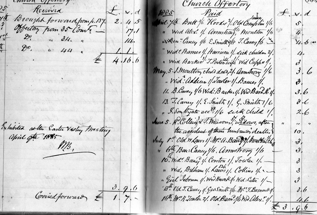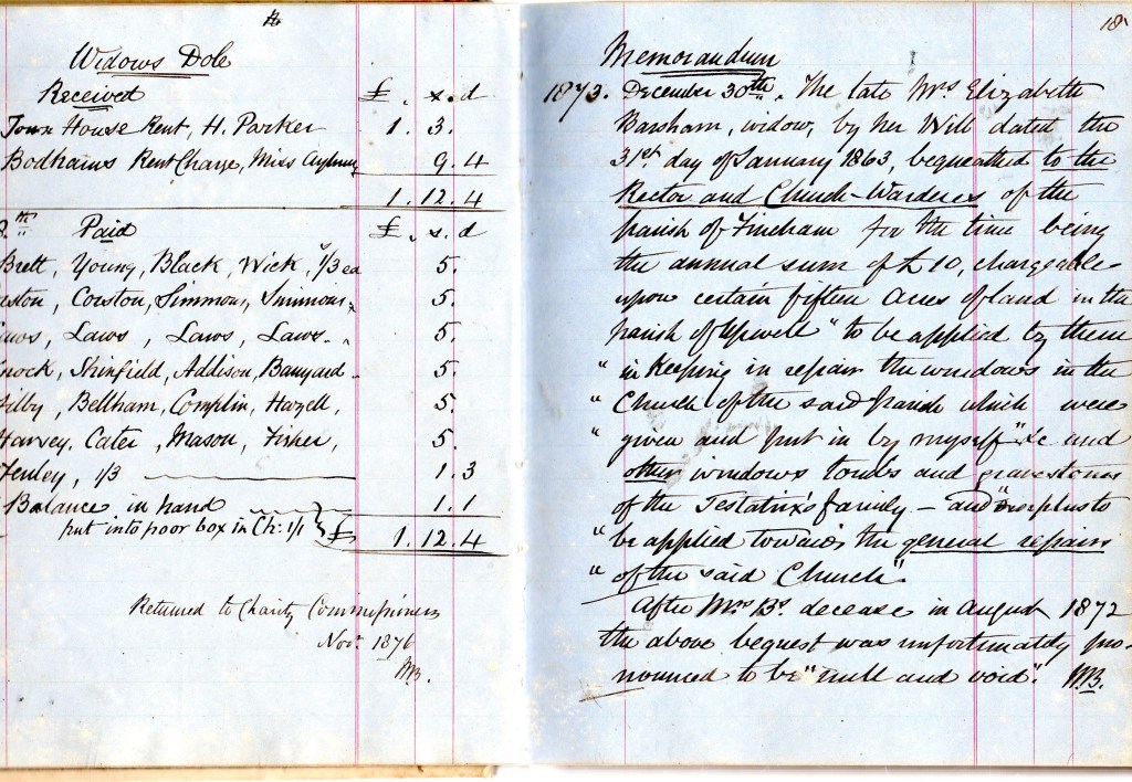 This entry mentions the ‘Widows Dole. There is also a ‘memorandum’ from 1873 about Mrs Elizabeth Barsham leaving to the church, in 1863 £,10 to keep in repair the windows she had paid for and other church repairs. The fact that after her death the bequest was declared ‘null and void’ is lamented upon.