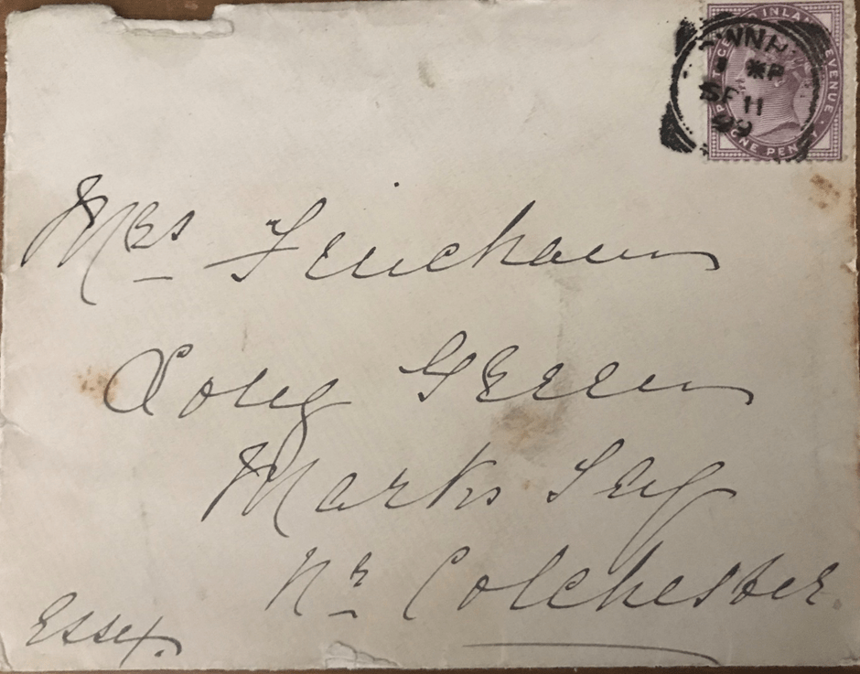 We recently received the original of this letter from Sue Smith in Mersea who had found it in her attic. It was addressed to a Mrs Fincham in Long Green, Marks Tey and was from a Mrs. Edwards who lived in Shrublands farm. Her handwriting was very eccentric but after some hard work by Anna, Janet, Linda and Stewart we think we have decoded it.