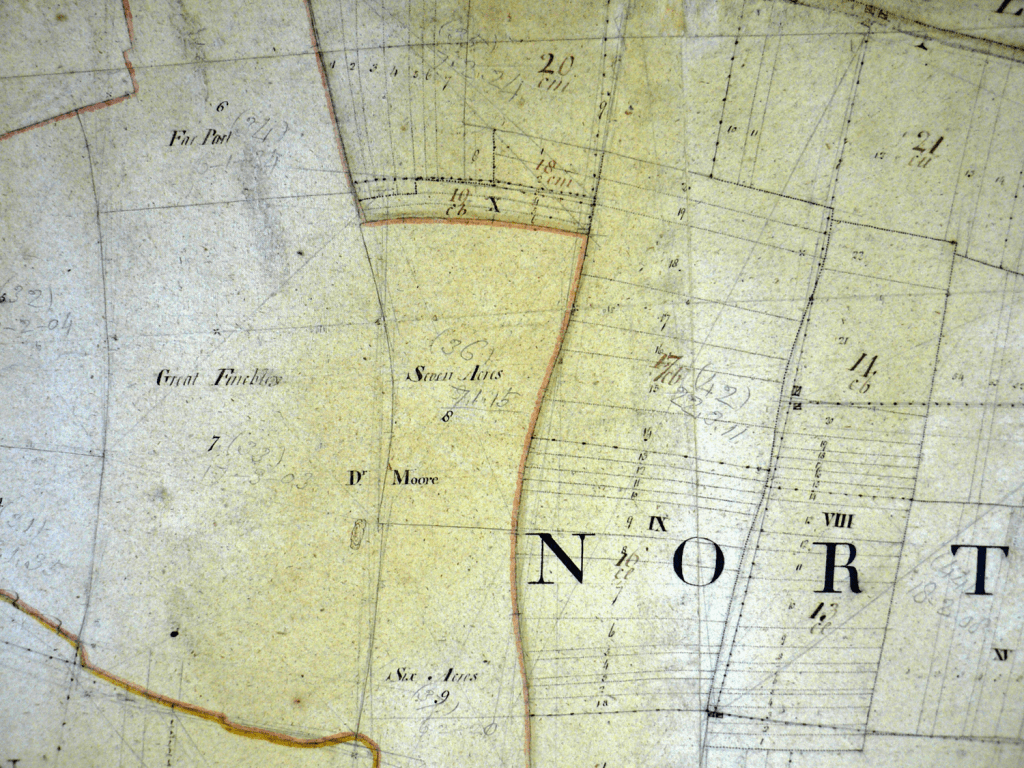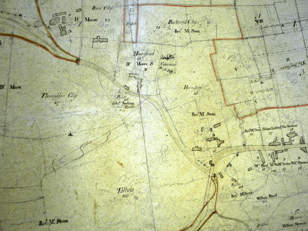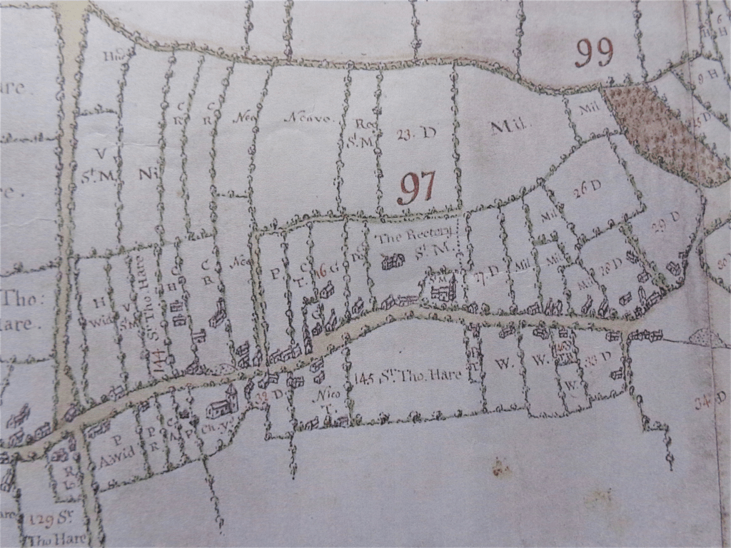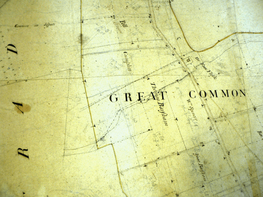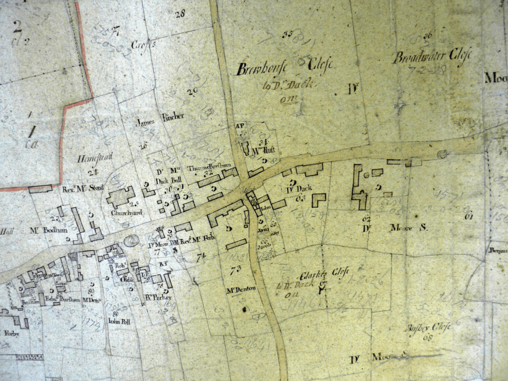 The ancient system of dividing the land into strips, the large fields containing many of the strips and the commons can be seen from the old mapping. The new ‘enclosed’ field boundaries are superimposed over this old system. There are however many examples, especially near the village, of old enclosures.