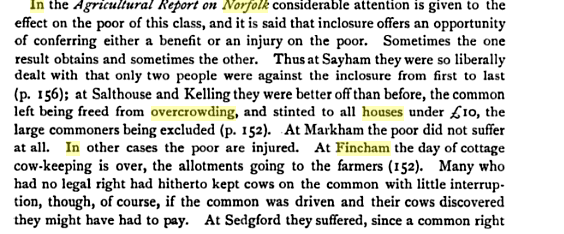 Of the 3,487 acres given, the arable land of the parish accounted for 1,747 acres, contained in four huge fields averaging well over 400 acres apiece and named respectively Eastfield, Southfield, Langholmefield and Northfield. The enclosed land of the parish consisted of 1,028 acres, including all the dwelling houses with their yards, gardens, and paddocks, while the commons and waste-land made up the rest. The largest of these commons, which naturally lay on the outskirts of the parish, was “the great Common called the Westheath and Besenell” which lay to the south-west and consisted of over 400 acres. Sir John Hare, as lord of the manor, owned 1,094 acres in the parish. His two chief tenants were Mr Drury and Mr Gibbons, both of them members of old Fincham families, who farmed nearly 1,200 acres between them. There were several other farms varying from 116 to 377 acres, while a stretch of rough land, lying in the south-east corner of the parish and known as the Loyes, was rented by Mr Richard Pretyman who, as he did not live in the parish, was probably merely a “sporting tenant.”