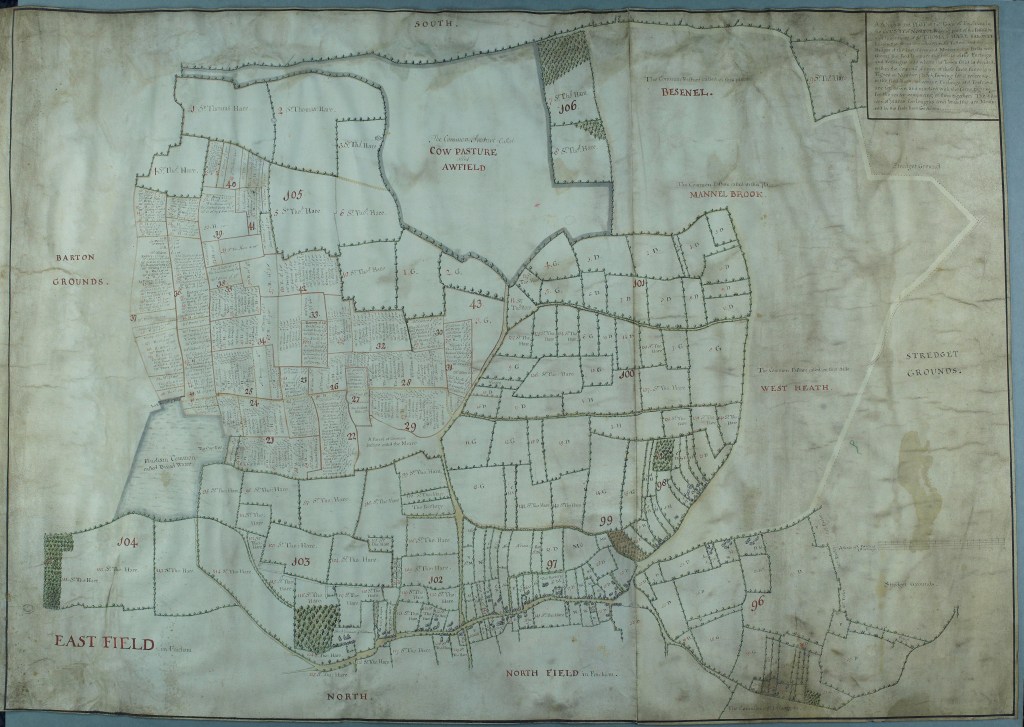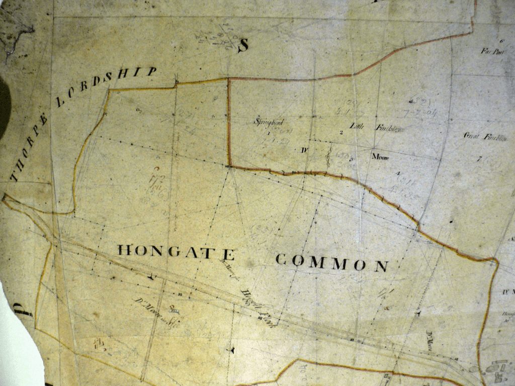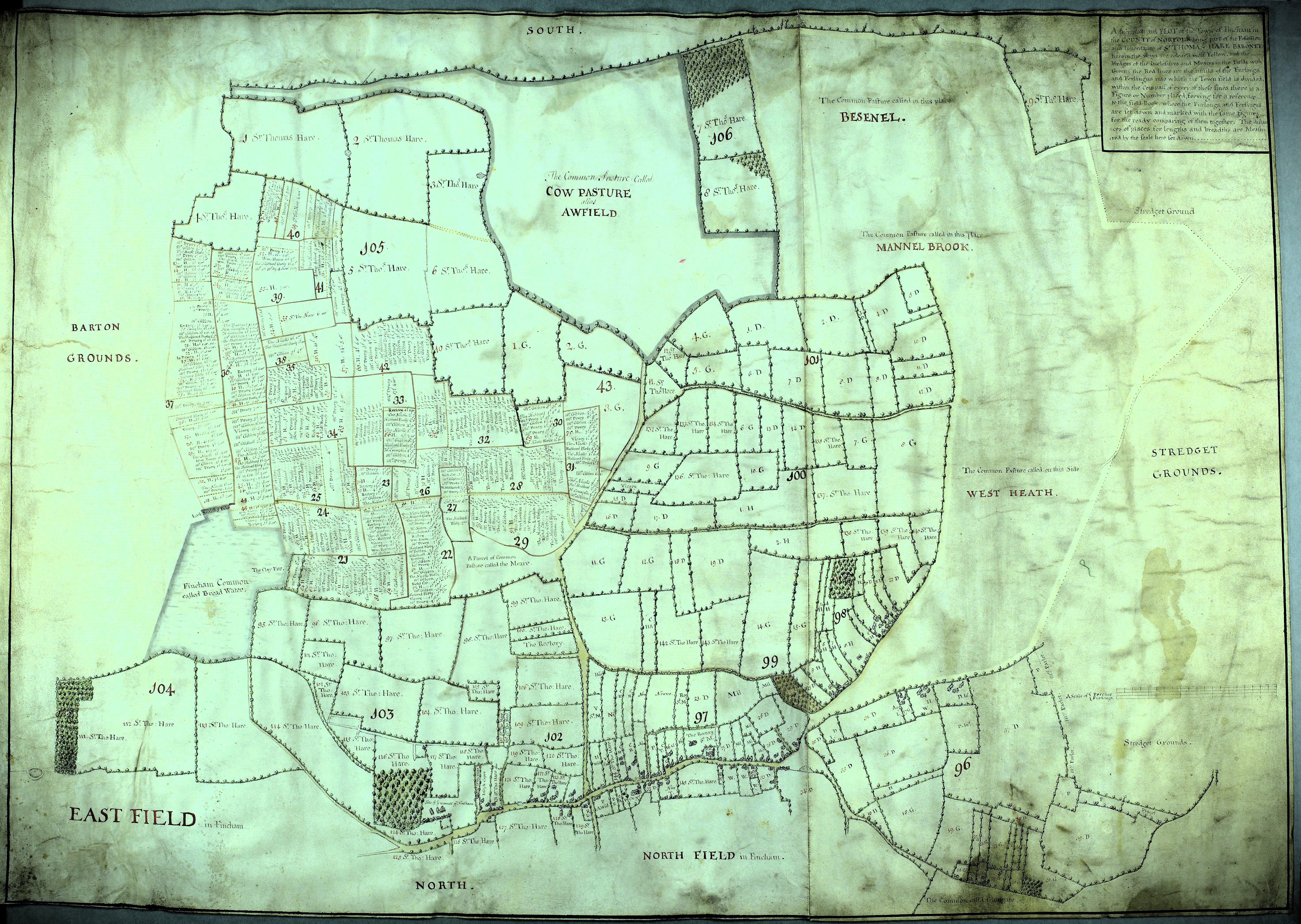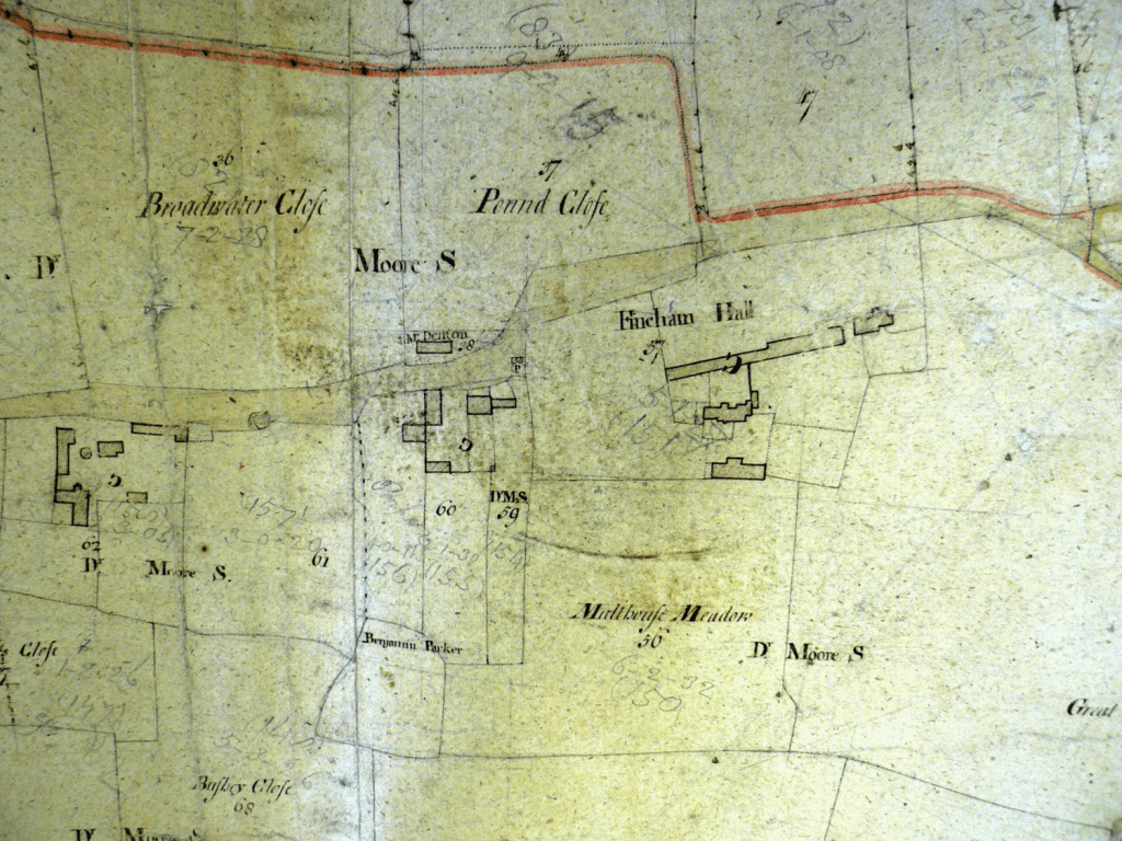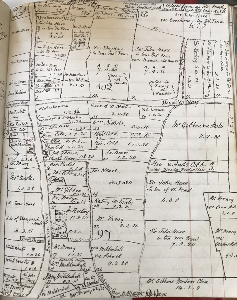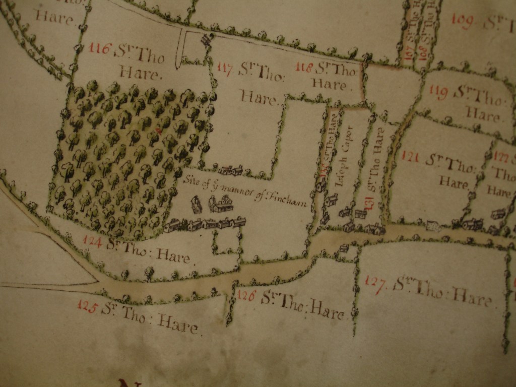 The date of this map is only approximate, but its purpose is not. Sir Thomas Hare was a deputy Lord Lieutenant of Norfolk and powerful land owner within the locality. This map, together with a field book, records the extensive landholdings of the Hare family in the area to the south of the village and it is unusual in that it is oriented to the south rather than the usual convention of the north. The document does not encompass the entire parish but does illustrate life in Fincham during the reign of Charles I.