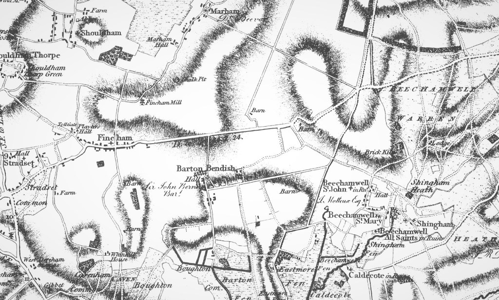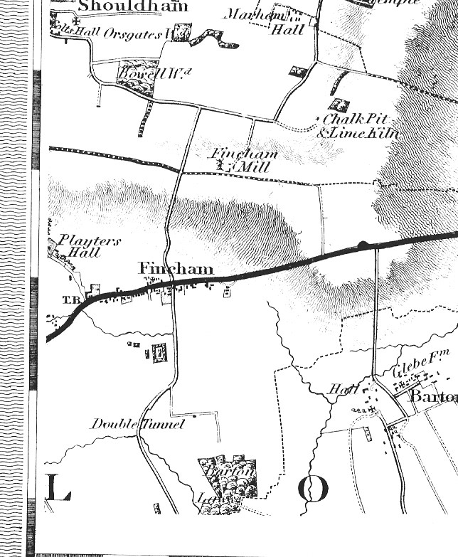 This map was published by William Faden, called ‘geographer to King George 111 and the Prince of Wales’. It is a scale of one inch to one mile. Parish boundaries are not shown but Hundreds are. Faden used a system of hachures to show relief. For example you can see the higher land as you go north up the Marham Road on which Fincham Mill is marked, The only house named is Playter’s Hall. The map was sold on a subscription basis and it has been suggested that subscribing to a map would have got your house named! Certainly the Finchams were long gone from the Hall but one would have expected it to be named. There is a farm marked where Raven’s Farm is today. There is a toll gate marked near Playter’s Hall on the way to Shouldham Thorpe -and hence Lynn. There was a cottage on this road within living memory, but now demolished, called Toll Cottage. Only a small area of trees is marked and no obvious commons -Fincham was already enclosed of course. Road layouts compared to existing roads are interesting to work out.