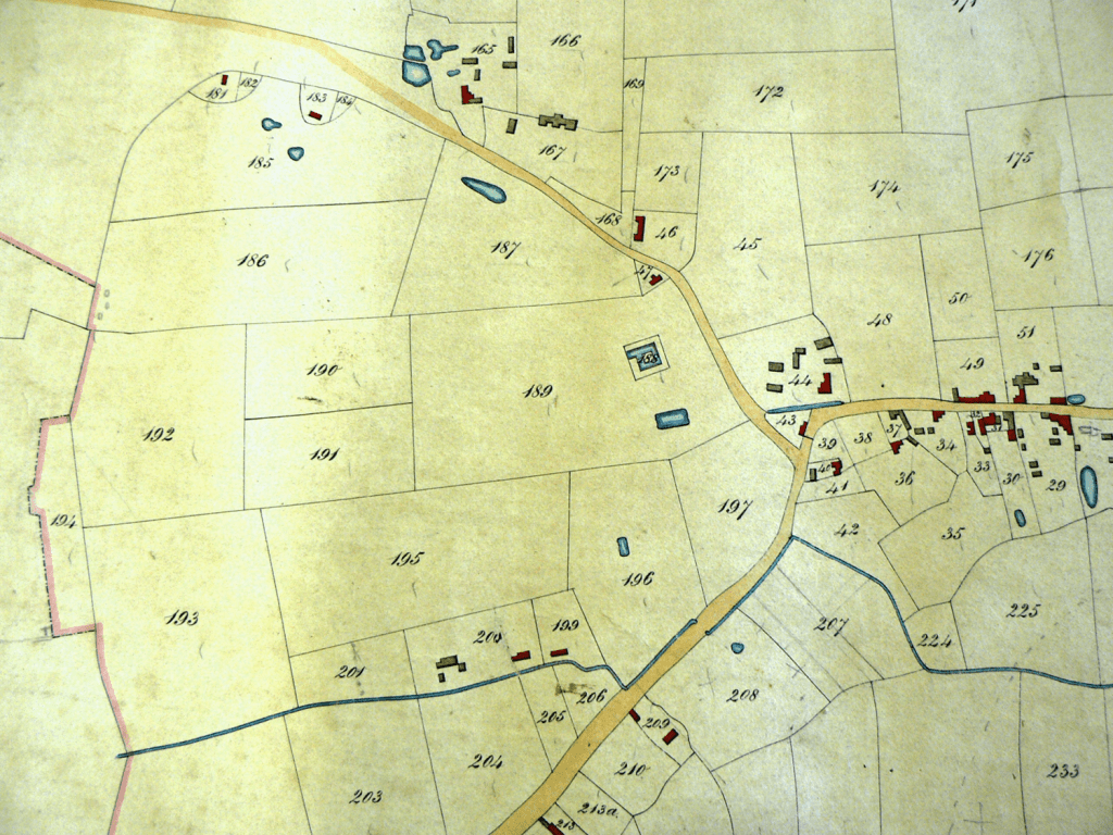 Each map will show at least the boundaries of woods, fields, roads and waterways and the location of buildings. The houses are sometimes shown in enough detail to show their shape. Occupied structures are shown in red whilst support buildings such as sheds cart stores and barns are shown in black.