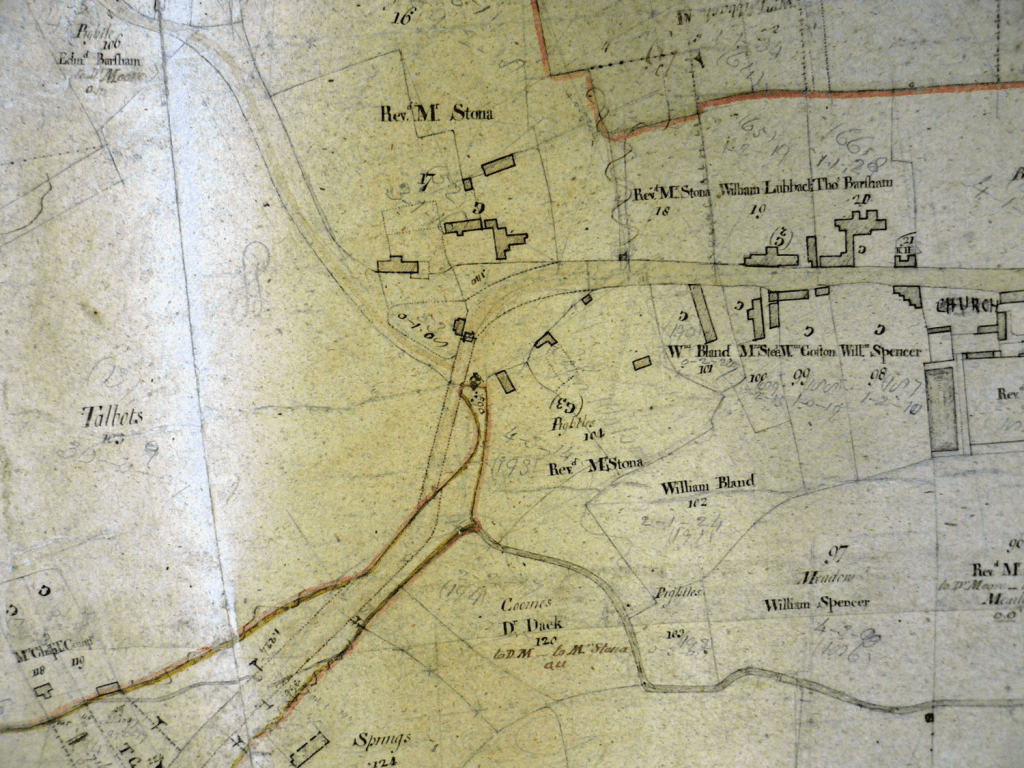 We now come to the cross roads. At the corner on the west side of the Boughton way, was a fair sized plot of ground occupied by Widow Howson and next to it is a narrower strip of land marked “the site of the vicarige of St. Martin’s, the house and croft.” Though the map fails to show any house standing on this plot it was undoubtedly here that the Vicar of St. Martin’s lived, the Rector of St. Michael’s living further down the road. The pond in front of St. Martin’s church was very much as it is now, though there was a small cottage almost adjoining it at the east end. The space immediately behind the pond is in 1636 recorded as “a pece of wast grounde belonging to the Chappell of All Saints.” but in an earlier survey of 1575 which Canon Blyth saw at Stow, this is still more fully specified as “waste ground called chapel hille, late All Saints” of which all all other record has now disappeared.