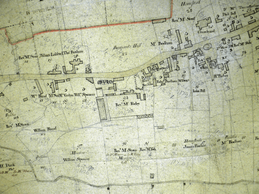 Opposite the Rectory, “the site of the maner of Banyards hall” is marked though there are no signs of any buildings there. This was one of many small manors into which Fincham was divided and and derives its name from Sir Ralph Bainard, one of the conqueror’s knights to whom the manor was granted. Other sites of manor houses marked on the map or mentioned in the survey are Coombe’s manor on the left side as the road curves round to Stradsett; Little Well Hall on the same side almost opposite the chapel (and not on the site marked on the Ordnance map); Fairswell manor, on the left-side of the Boughton way where it began to cross the open pasture; and Curple’s manor, to the west of St. Michael’s church.