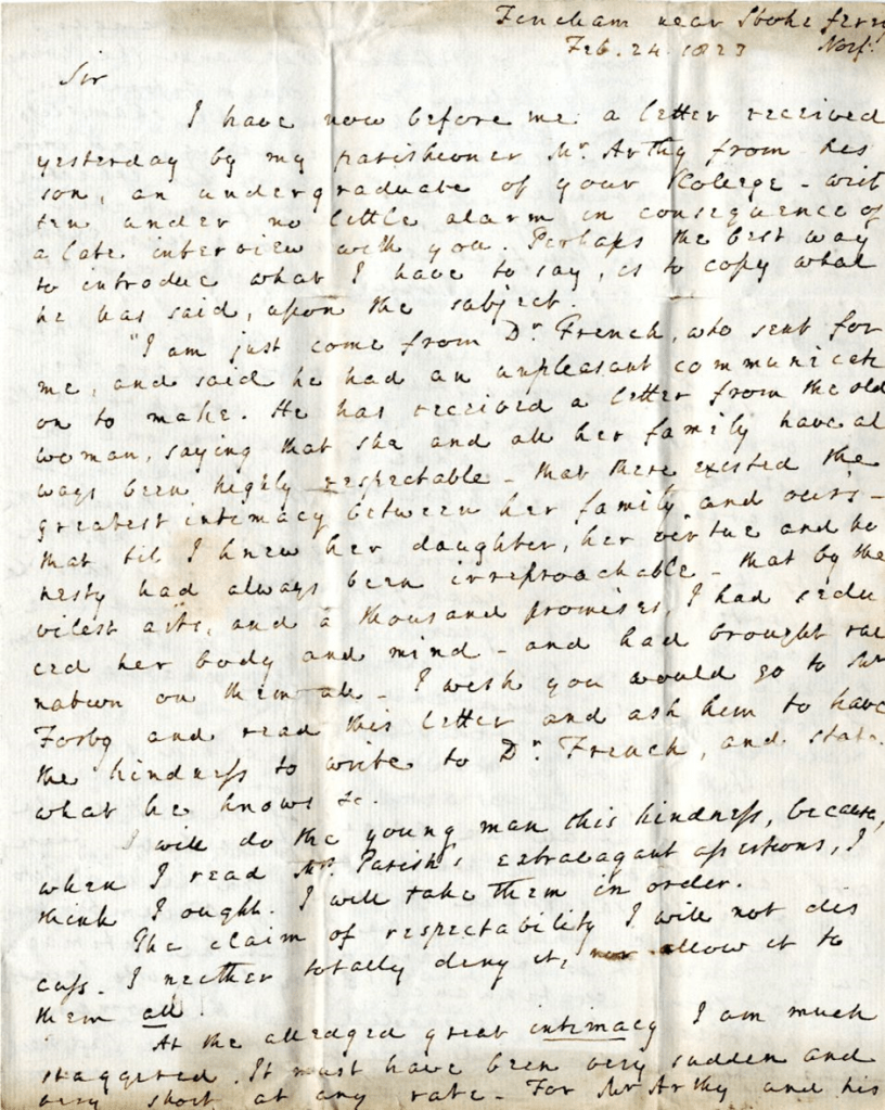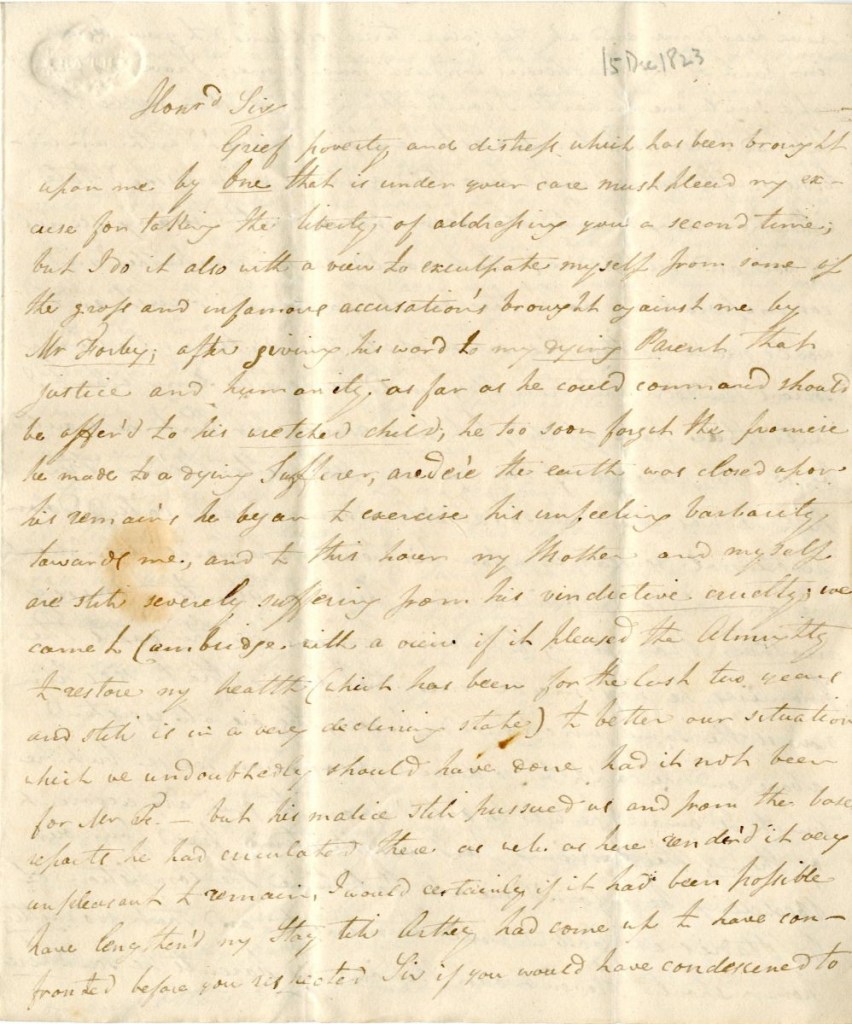 The first is a letter from Maria Parish, a woman from the village of Fincham in Norfolk. Her letter recounts how following numerous declarations of commitment and a promise of marriage from John Henry Arthy (admitted to Jesus College, 8th February 1820) she “forfeited my honour and happiness” resulting an unexpected pregnancy. Following this announcement, Maria claimed Arthy cut all ties with her and so she decided to write to the Master in the hope that he might be able to convince Arthy to acknowledge his responsibilities and return to Maria. Through Mr. Burleigh of Barnwell, a family friend of the Parish’s, Maria and her mother were admitted to see William Hustler who was, at the time, Arthy’s tutor. Initially, as Maria acknowledges in a second letter to the Master, her “wretched case” was initially received “very warmly” by French, with his agreement that Arthy “certainly deserved punishment”. She is also very clear to highlight her family’s “respectability” and that such a case had brought great shame upon them.