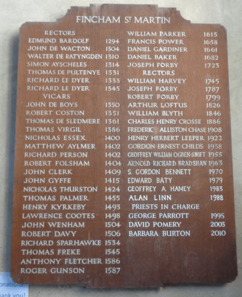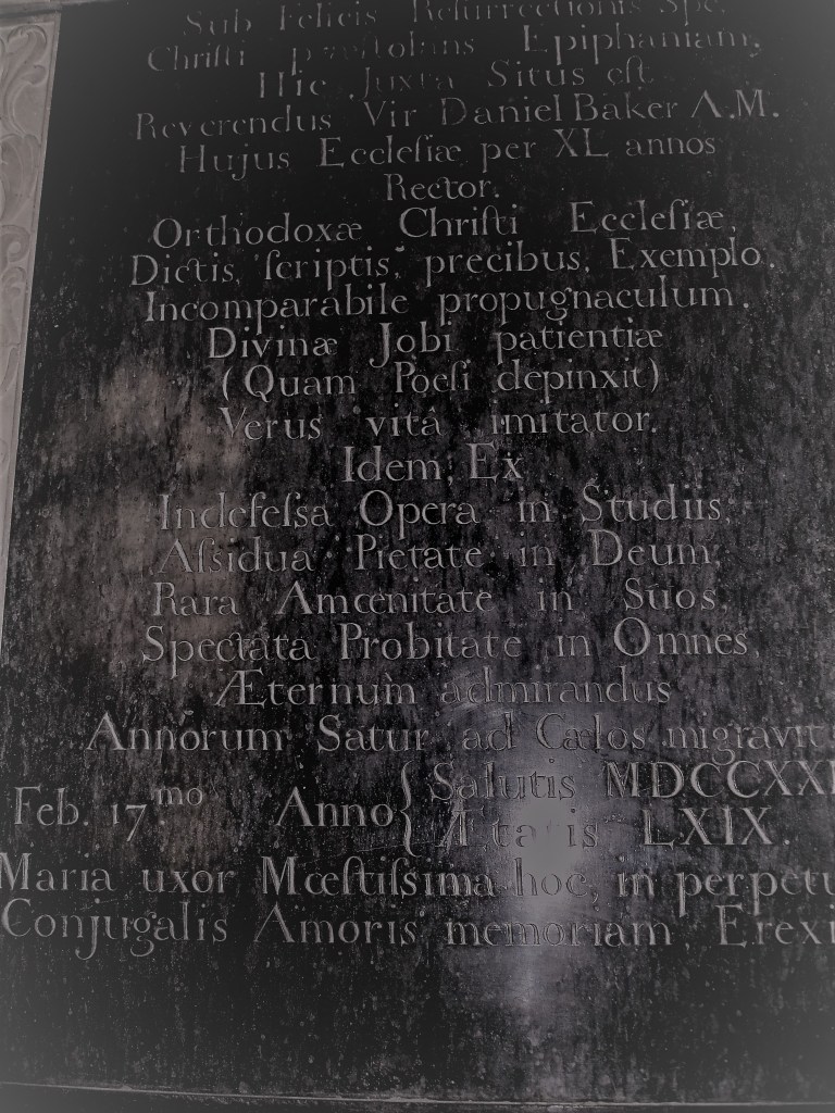 Memorial tablet to Rev Daniel Baker firstly put up in St. Michael’s church and moved to St. Martin’s after the demolition of 1745. For details see under Rectors.