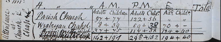 We can see the records for Fincham in the 1851 Census of Religion (see the Norfolk Record Society Vol LXII) but William Blyth, the inveterate recorder, also took a census of church attendees in 1866 and in 1874 and noted them in his diary. (However, it should be remembered that like is not being compared with like as for instance Fincham St Martin’s did not hold an evening service and the totals did not account for those attending twice or even three services on a Sunday or even some villagers attending both church and chapel.)