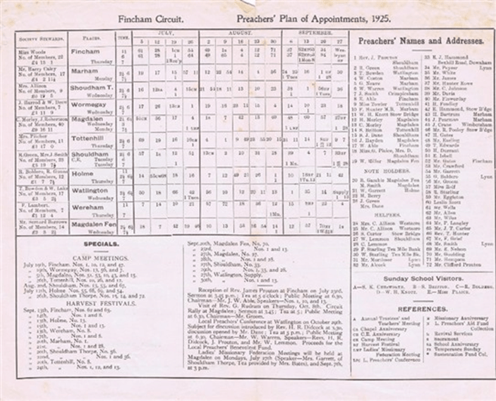 Chapels were organised not by parish as the Anglican churches were but in districts or circuits . These circuits might change to be amalgamated with other circuits or to become a circuit of their own. The number of different circuits that combined or reformed is explained on the section of the Norfolk Records Office online catalogues under Records of the Downham Market Methodist Circuit.