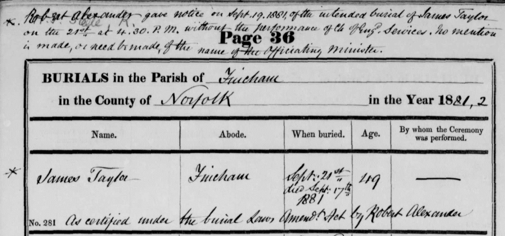 “Robert Alexander gave notice on September 19th of the intended burial of James Taylor on the 21st at 4.30 pm without the performance of” church ?” services. No mention is made or needs to be made of the officiating minister”