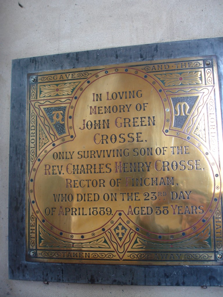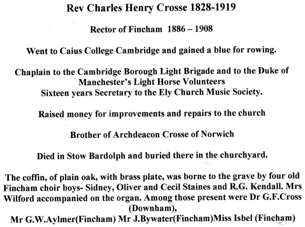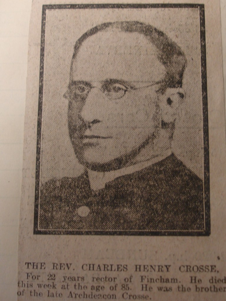 Newspaper Cutting (Eastern Daily Press) 24/12/1913: ‘Death Of The Rev. C.H. Crosse. “One of the best known ecclesiastics of the county passed away on Monday in the person of the Rev. Charles Henry Crosse, M.A., M.L., who was for twenty-two years rector of Fincham. His last days, since July, have been spent at Stow Vicarage, the residence of his niece (Mrs C.E.H. Wilford, wife of the vicar of Stow), and the end came on Monday as the result of senile decay after about a month’s illness. He was 85 years of age. The rev. gentleman was appointed to the rectorship of Fincham by the Lord Chancellor in 1886, succeeding the late Canon Blyth, and after doing excellent service towards the restoration of the fabric of the church and the revival of public worship, retired some five years ago. He was a brother of the late Archdeacon Crosse, and leaves a daughter, Mrs Cecil Tennant.