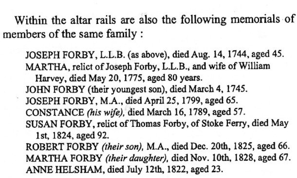 A brass plate commemorative of the restoration of the Church in 1847 was put up at the expense of Mrs Barsham.