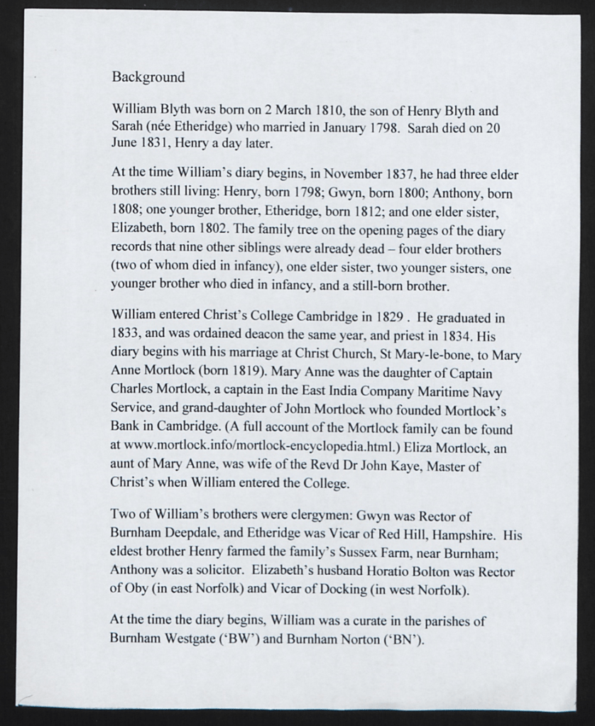 William Blyth was born on 2nd March 1810 the son of Henry Blyth and Sarah (nee Etheridge) who married in 1798. William entered Christ’s College Cambridge in 1829. He graduated in 1833 and was ordained deacon in the same year, and priest in 1834. His diary begins on November 1st 1837 with his marriage at Christ Church, St Mary-le-bone, to Mary Anne Mortlock, born in 1819. She was the daughter of Capt Charles Mortlock,a captain in the East India Company Maritime Navy and and grand-daughter of John Mortlock who founded Mortlock’s Bank in Cambridge. Two of William’s brothers were clergymen. Gwyn was Rector of Burnham Deepdale and Etheridge was Vicar of Red Hill Hampshire. His eldest brother, Henry, farmed the family’s Sussex Farm near Burnham Market and his sister Elizabeth’s husband, Horatio Bolton, was Rector of Oby, in east Norfolk, and Vicar of Docking,in West Norfolk. A further brother Anthony, was a solicitor. William was the first captain of the Christ’s College Boat Club in 1830, and stroked the College men’s VIII to be Head of the River, on 18 May 1833. The recently restored college Boathouse has been named the Blyth-McGregor Boathouse in honour of him and a more recent rower. William was also a contemporary at Christ’s of Charles Darwin, and, according to the College magazine, “with whom he often went on botanizing expeditions” and was “fond of recalling Darwin as he had known him, a `boisterous youth’, whose life was yet free from vice.” At the time his diary begins, William was curate in the parishes of Burnham Westgate and Burnham Norton. He moved around in the next few years as curate of Sedgeford, Docking, Hackford and Banningham.