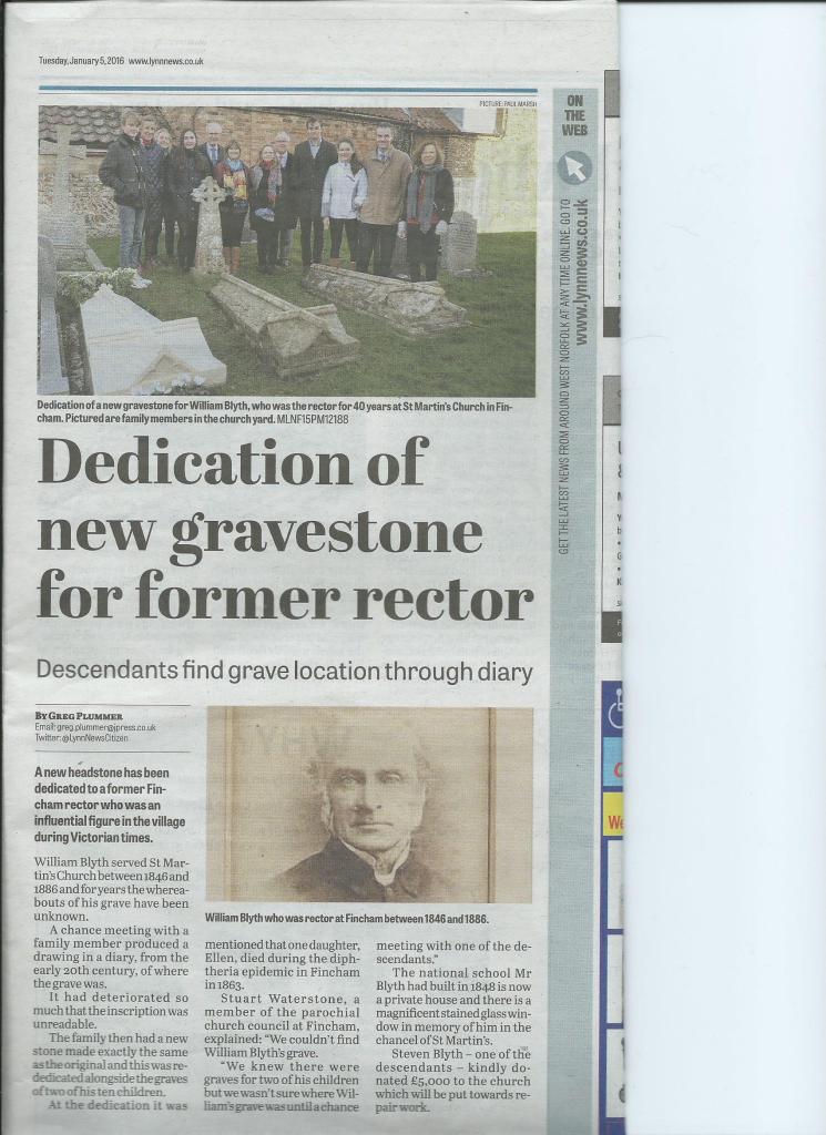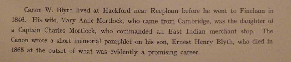William Blyth came to Fincham in 1846. He was thirty six and his wife Mary Ann twenty seven. His father was a farmer and landowner, Henry Blyth, who ws a neighbour of the pioneering agriculturist Thomas Coke of Holkham. Henry owned Sussex Farm near Burnham Market. He is mentioned in almost the same breath as Coke in agricultural reports of the time. He had a large number of children who benefitted from his largesse. He bought the advowson of Fincham St. Michael’s and St. Martin’s for £3000, a huge sum in the early 19th century. So William came into the wealthy living at Fincham when the village must have been in considerable turmoil. The previous Rector, Arthur Loftus, had been deprived of the living after a trial in the Consistory Court which detailed some scandalous events that surely left villagers feeling almost without a church.