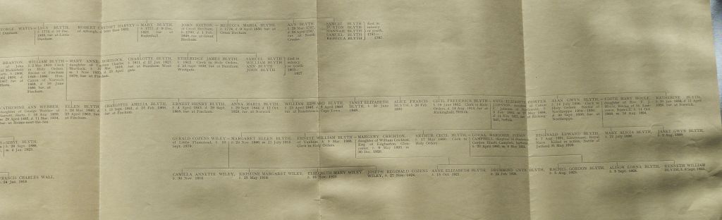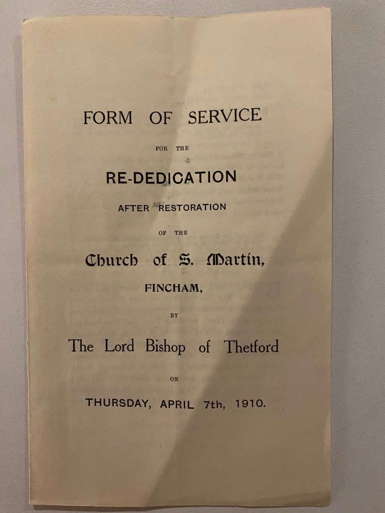 William Blyth had two sons who had children. Kenneth Blyth from whom we have got so much information and archive material is descended from Rev Cecil Frederick Blyth (1852-1913) and Mary Blyth, born in 1896, was the daughter of Rev Alan Gwyn Blyth (1856-1930). This writing done by Mary in 1910 is a delightful insight into Edwardian Fincham. Aunt Alice is William’s daughter who died in Norwich in 1942 aged 92 and Aunt Janet is another daughter who died in Norwich in 1950 aged 101. These sister’s lived in Norwich together probably from when William died in 1886 until Alice’s death in 1942. The new roof on the church was done in the major restoration project led by Admiral of the Fleet, Sir Gerard Noel, who lived at the Moat House. Reggie and Arthur are cousins, sons of Rev Cecil Frederick who, with his wife Anne, are the Uncle and Aunt referred to.