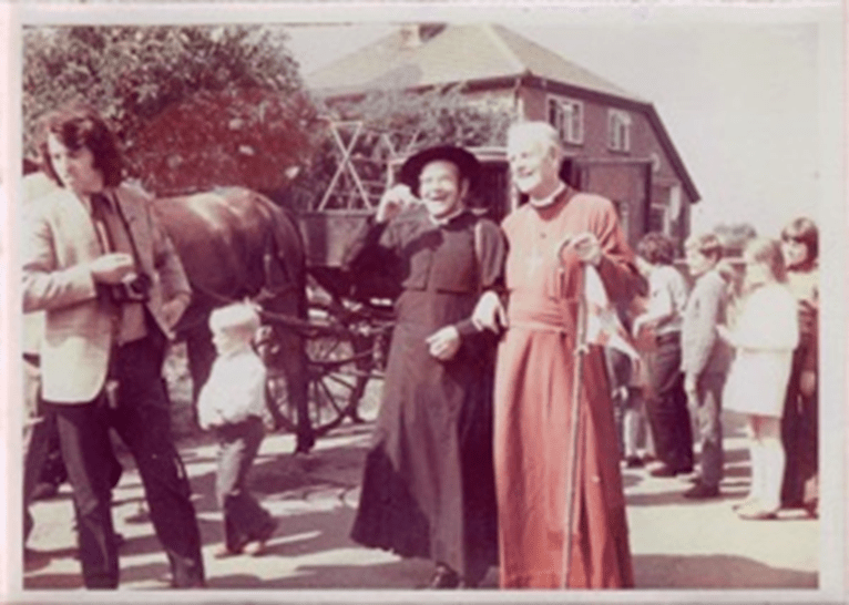 In 1973, Ely Cathedral celebrated its thirteenth centenary, with a series of events. They had a notional “beating of the bounds” of the diocese, whereby the bishops visited all the boundary parishes, and met with the people there – visiting schools and suchlike, and being entertained. For the set of events in the Fincham area, he asked Stanley to be his chaplain (i.e. a kind of P.A.). Stanley decided to wear his Spanish wide-brimmed hat. The Bishop asked why, but was completely convinced by his explanation: Stanley was not tall, and would be a be-cassocked figure amongst lots of be-cassocked figures; if the Bishop needed to find him, he would have only to look for the hat!