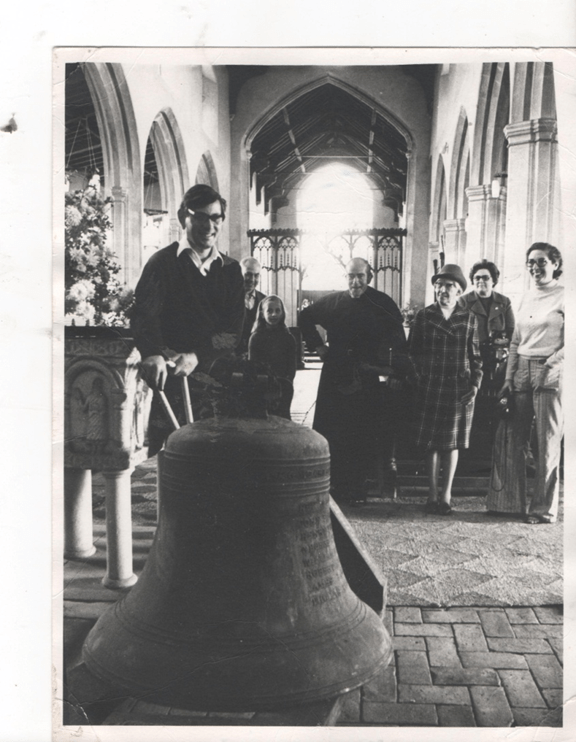 1976 –Rev Gordon Bennet looking on as Owen Needham manoeuvres re-cast bell. Also in photo are Mrs Bennet (back) Mrs Hodgson, churchwarden, and Mrs Needham (on right). The bells were dedicated on Whitsunday June 6th 1976 by the Bishop of Ely, The Rev. Edward Elien. The ringers were: -treble -Owen Needham 2nd- Sarah Harrison 3rd Claire Hodgson 4th Fiona Luckchant 5th -Frank Harrod 6th -Simon Needham