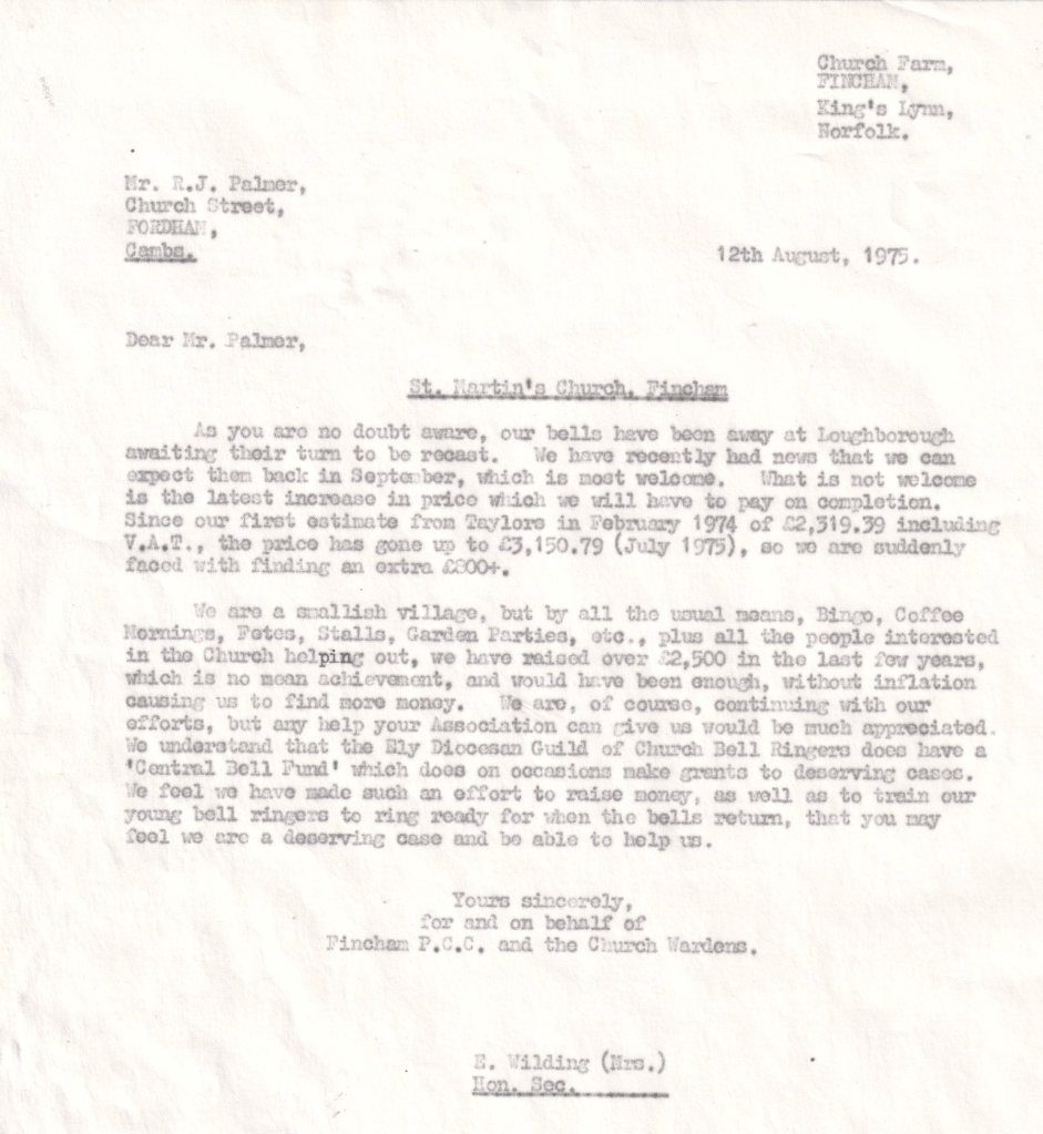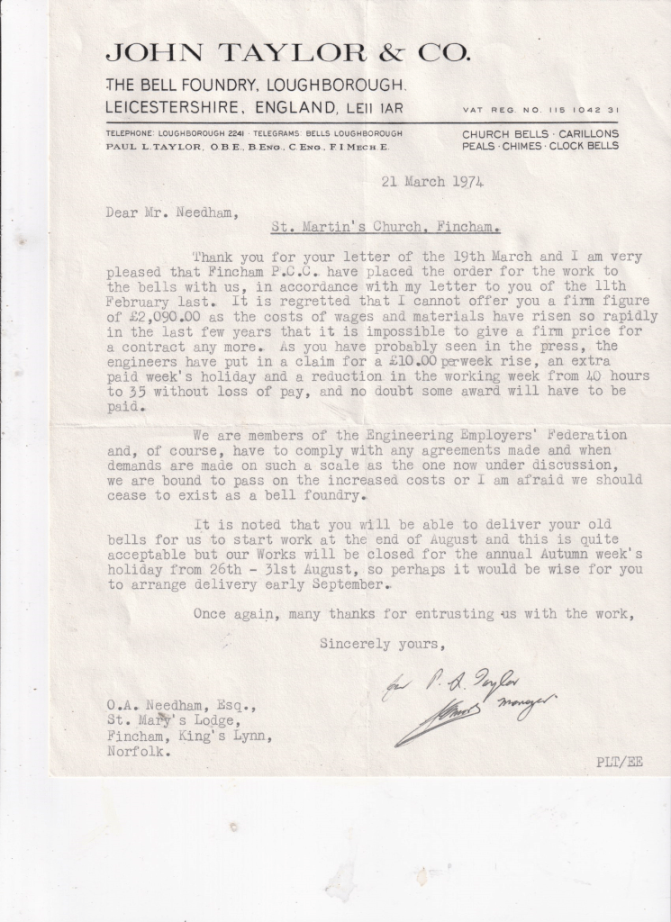 Finally the bells arrive in Fincham. No wonder Owen Needham looks pleased! Only a small amount of his correspondence is shown. Endless letters, PCC meetings, getting a faculty and fund-raising over many years required perseverence and determination. Moreover letters show that he saved St. Martin’s over £500 by organising the taking down, transport of and re-installation of, the bells, a tribute to his engineering skills.