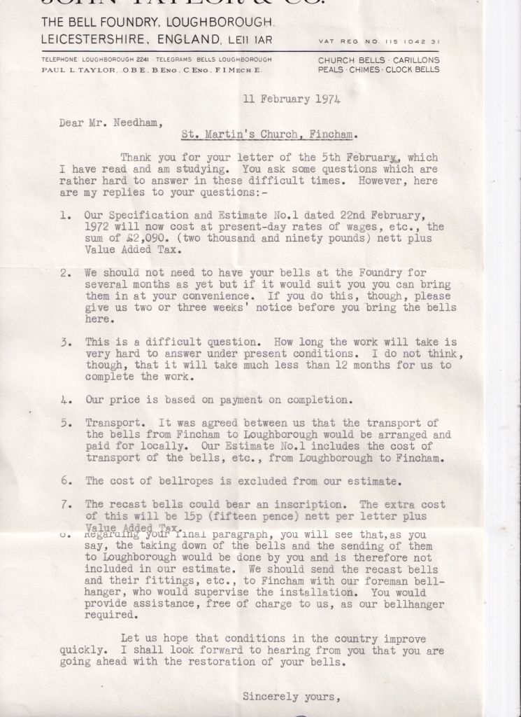 Some years passed and then Owen Needham started a correspondence with John Taylor and Co, of Loughborough. The ‘absolutely’ of’ absolutely necessary’ is underlined and set the tone for worrying about the cost.