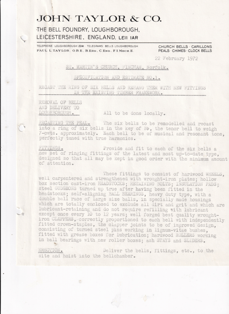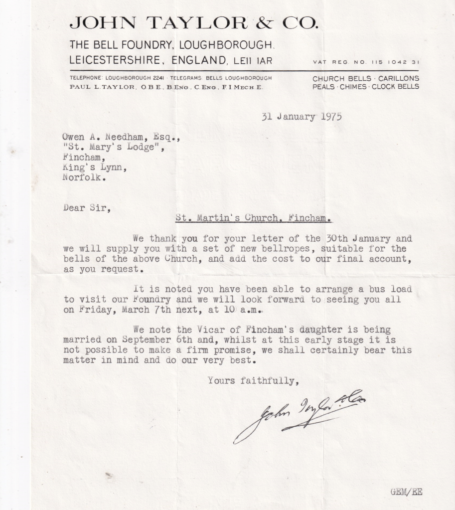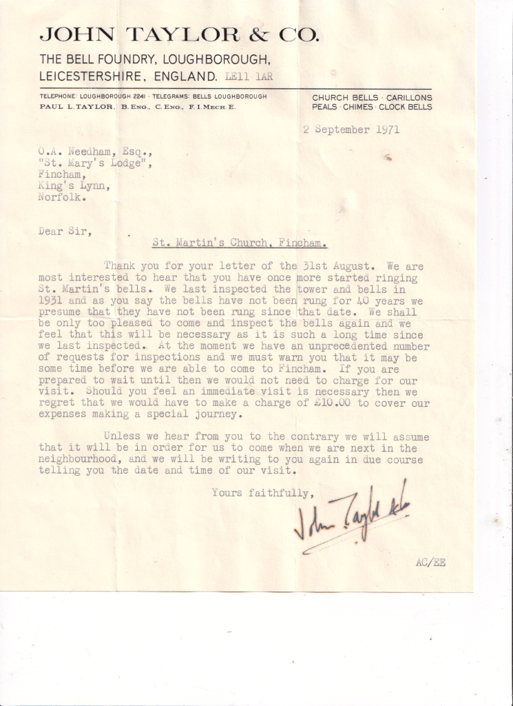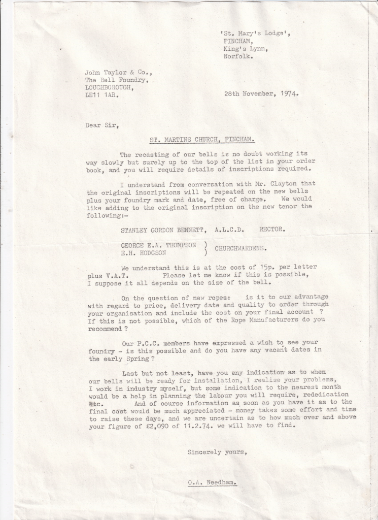 Recently (2023) correspondence between Owen Needham and two bell foundries has come into the society’s possession. There are some interesting exchanges between the parties, in the days not so long ago, when letters were handwritten or typed and sent by post.