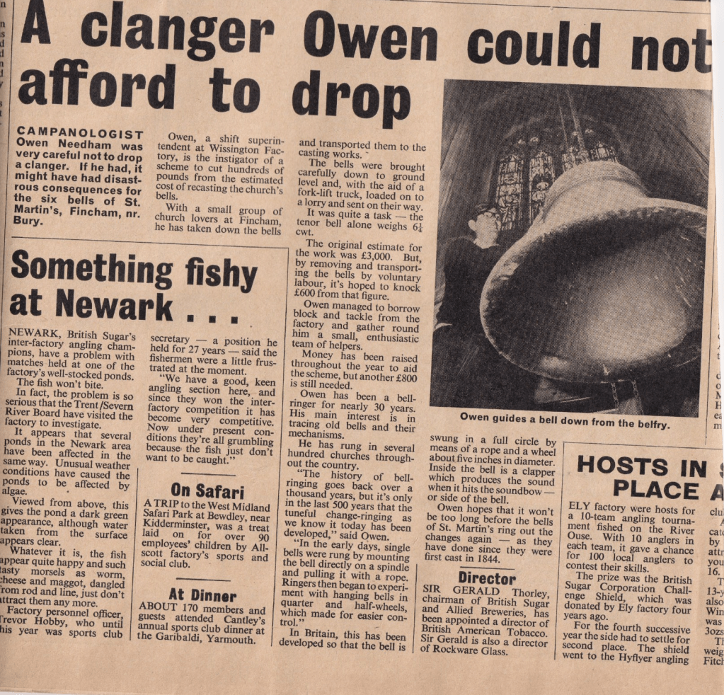 This is an article in the British Sugar News of December 1974 when Owen took the bells down. (The headline of the paper was, interestingly enough -THE TOUGHEST CAMPAIGN EVER!- a combination of a spring drought, Midsummer aphids and flooding during harvesting with very heavy rainfall later in autumn caused closure of factories at Felstead and Ely, the first time ever such action was taken)