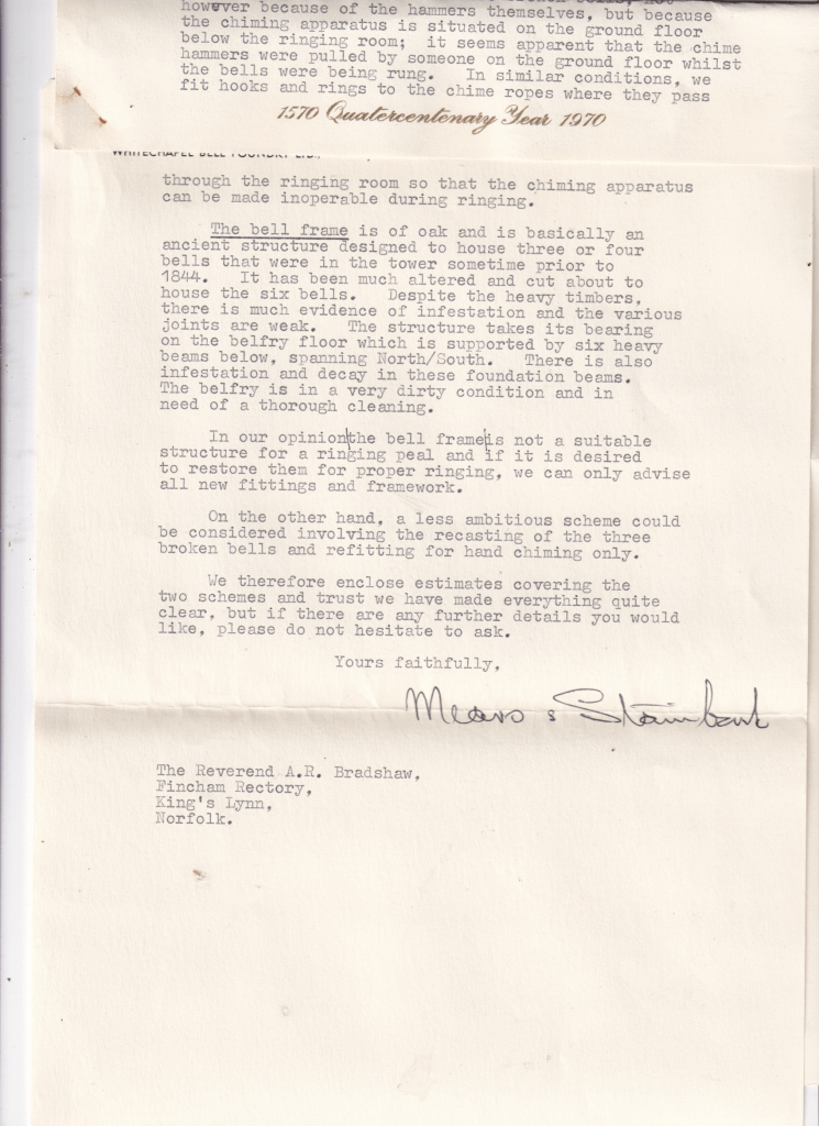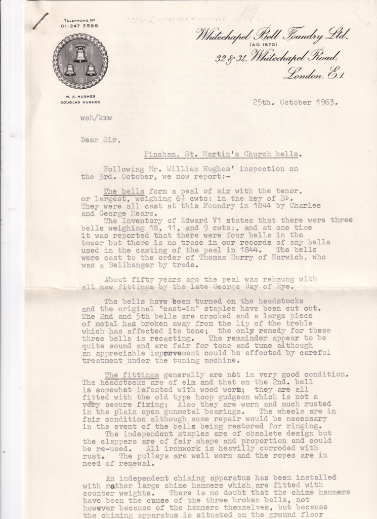 The first letter is from the Whitechapel Bell Foundry who inspected the bells in 1963 and gives some details of the history of the bells. The report concludes the bells and the bell frame are not in very good condition, to say the least. There are some interesting comments about the chiming apparatus and how someone caused the damage to three bells by using the apparatus whilst the bells were being rung. Remnants of the chiming apparatus are still to be found in the ringing chamber.