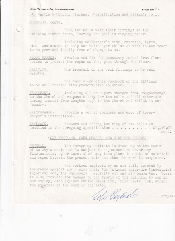 The estimate arrives. A second estimate was supplied for the bells to be rehung in an all metal frame made for eight bells. Two new bells to be supplied.