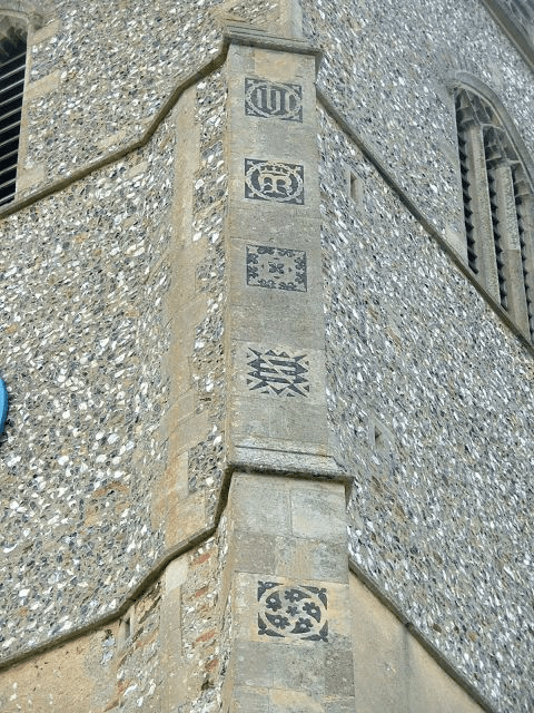 The buttress of the tower of St. Martin’s showing the Fincham coat of arms -fourth from the top.