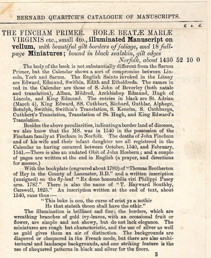 The following records that the manuscript known as the Fincham Primer was in the possession of the Fincham family in 1540. The deaths of John and Ela and an infant daughter are said to have occurred between October 1540 and February 1541. The infant daughter must have been born to Ela when she was aged about forty. This entry doesn’t say anything new anything about John and Ela but it is link to them as real people.