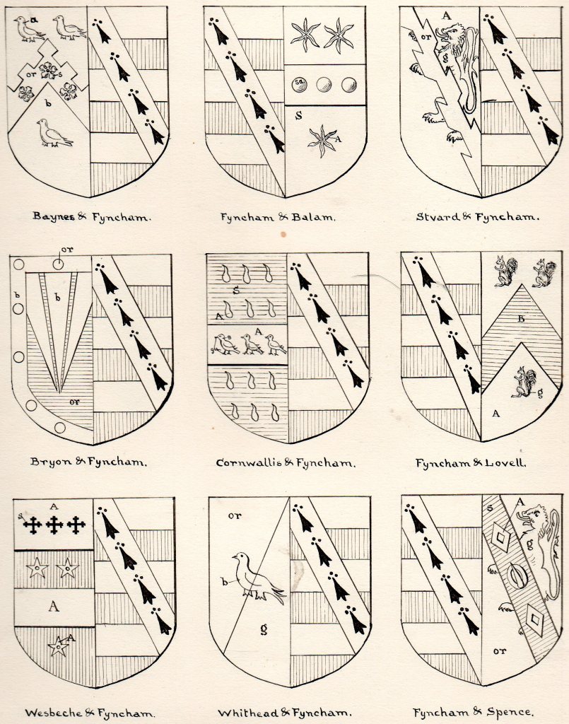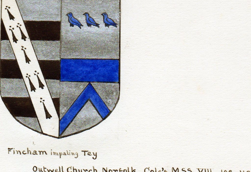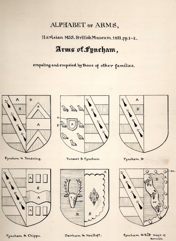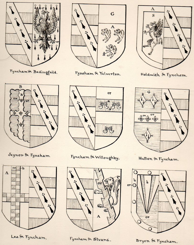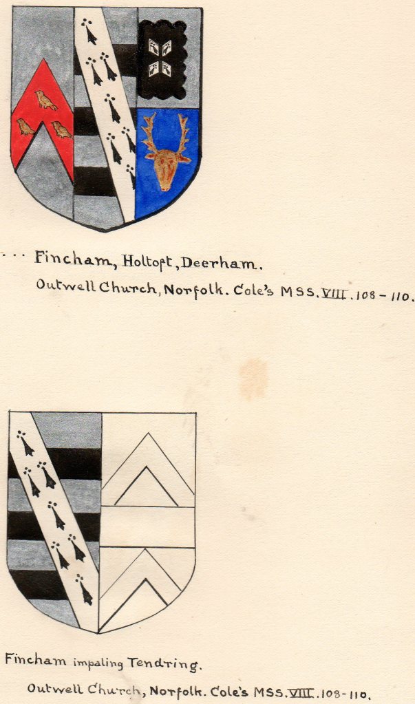Names to note are Cornwallis, Lovell and Bedingfeild which feature in the story of the family above. Other names can be found in the Fincham family trees in Blyth’s book. These Coats of Arms really emphasise the importance of the Finchams over many centuries. They married into so many upper class families.