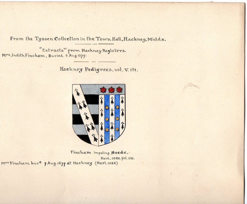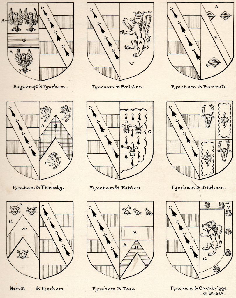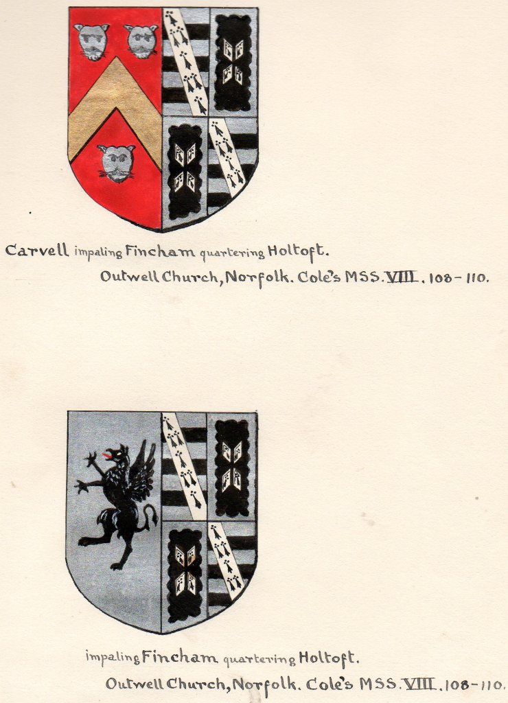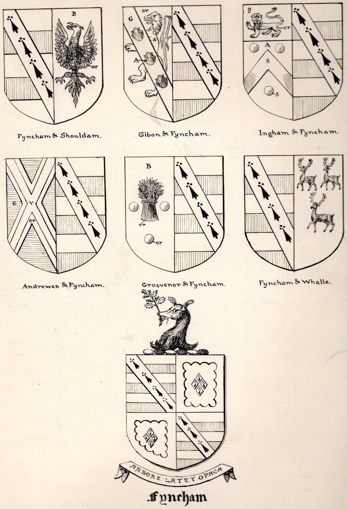 Names to note are Cornwallis, Lovell and Bedingfeild which feature in the story of the family above. Other names can be found in the Fincham family trees in Blyth’s book. These Coats of Arms really emphasise the importance of the Finchams over many centuries. They married into so many upper class families.