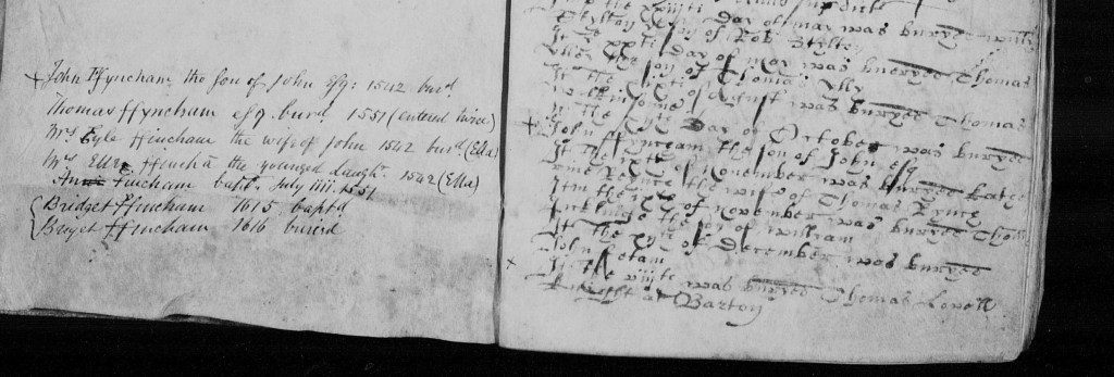 At some time in the early 17th century someone, presumably the Vicar of St. Martin’s, has summarised the entries for some Fincham family members. It is on a spare page of entries for 1542. It says:- (take your pick of spellings of ‘Fincham’)