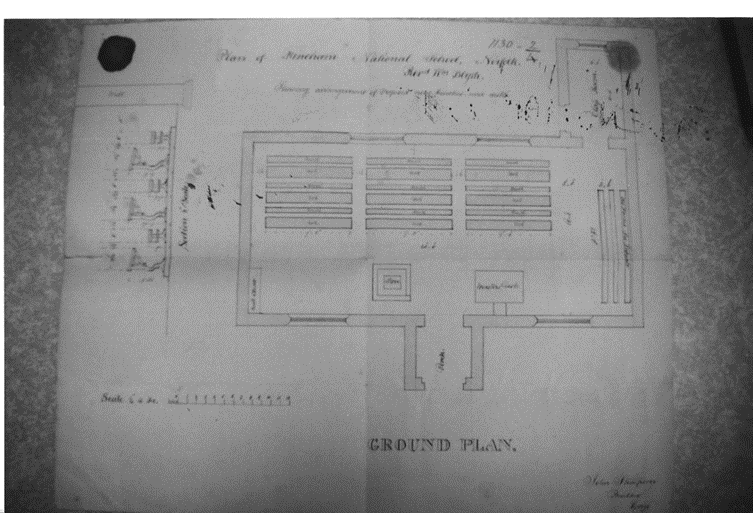 The 1848 building consisted of a large classroom running west-east with the infants and gallery to the east. There was a very small classroom to the southwest. Centrally on the north side was a porch. The schoolhouse to the southeast was built at the same time. In 1864 the small classroom was doubled in size by being extended eastward. In 1875 a further classroom was built to the north at the west end, with a boy’s cloakroom and a front porch northward to the street and a girls/infants cloakroom to the east. At some stage the small classroom became a boys’ porch and at a different time a storeroom. In the 1950’s the east half of the small classroom was demolished to improve light in the main classroom and the remaining space became an office. A curtain, later a wooden partition, was used to divide the main classroom. Initially the main classroom ran east-west the infants section partitioned off and a wall to the north between the main classroom and the 1875 classroom. A later plan show this wall removed so that the main classroom runs north-south. No records have been found relating to the 1882 date on the datestone in the east wall of the schoolyard.