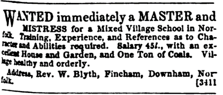 September 1853 The new mistress Miss Stone from Lincolnshire entered upon her duties with excellent testimonials, salary £30 pa but she was found to be inefficient and after notice agreed to stay until her replacement should be appointed. She was well disposed, obliging and sensible person but unequal to the management of 30 small children. Testimonials much too high.