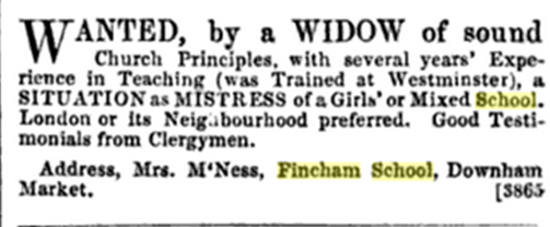 August 1853 The school mistress Ann Musgrove after due notice left Fincham. She had fallen into a melancholy mood and very eccentric habits quite unfitting for her duties. Advertised immediately for a replacement